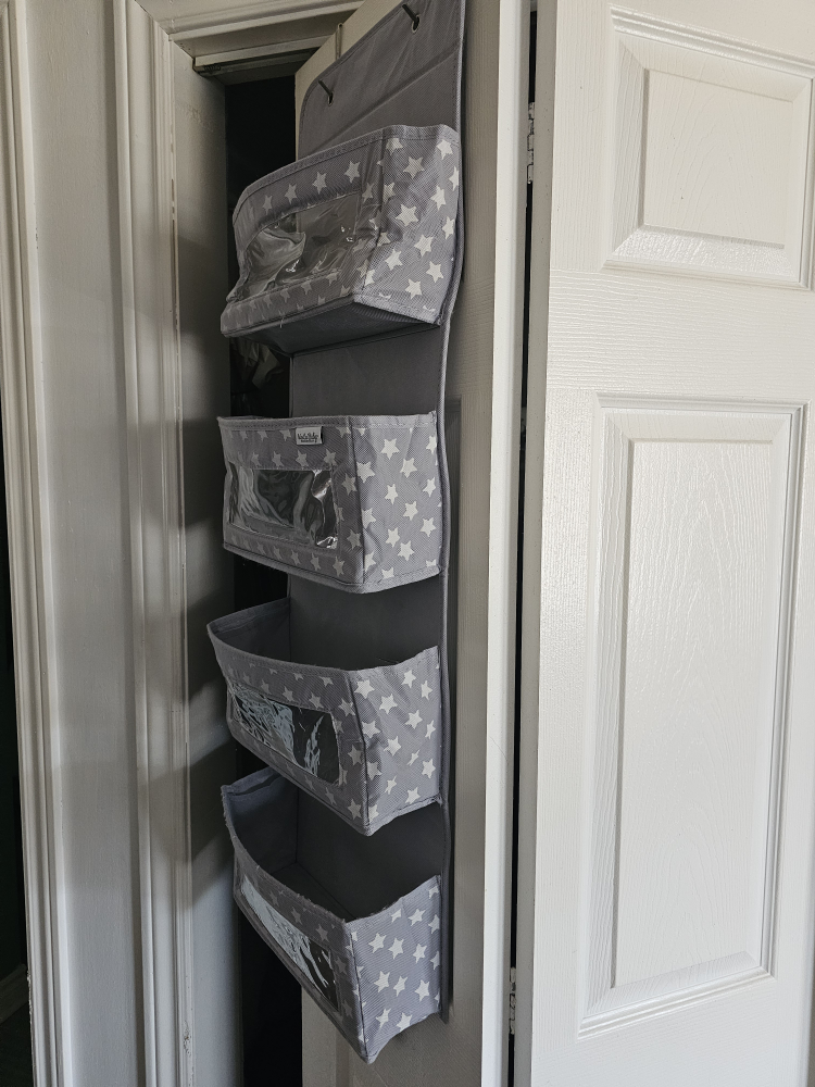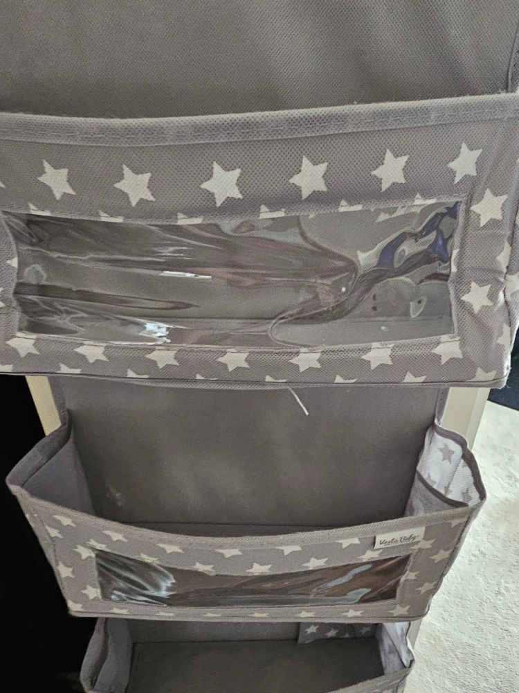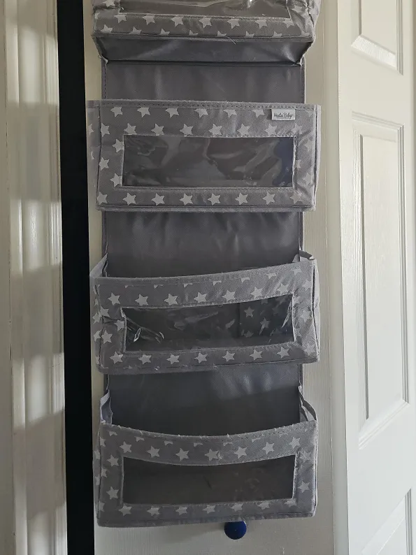 Declutter your little one's space with this Vesta Baby Nursery Decor hanging organizer! It's perfect for keeping diapers, toys, and other essentials neatly stored and easily accessible. The grey colour and star pattern will look great in any nursery