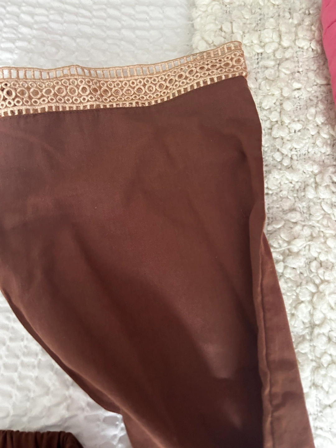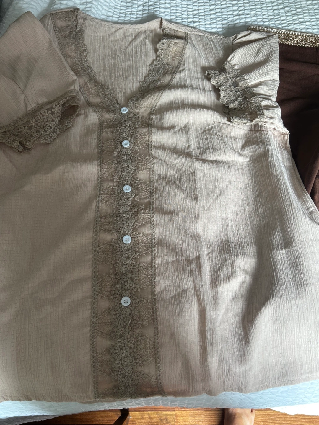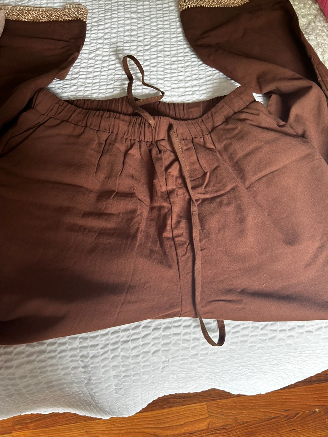 Brand new without tags size large A cute brown and beige outfit with lace detailing! Perfect for a casual day out or a comfy night in. The top features a V-neck and button-down design, while the pants have a drawstring waist for a comfortable fit. Pickup area Bayview and Sheppard.