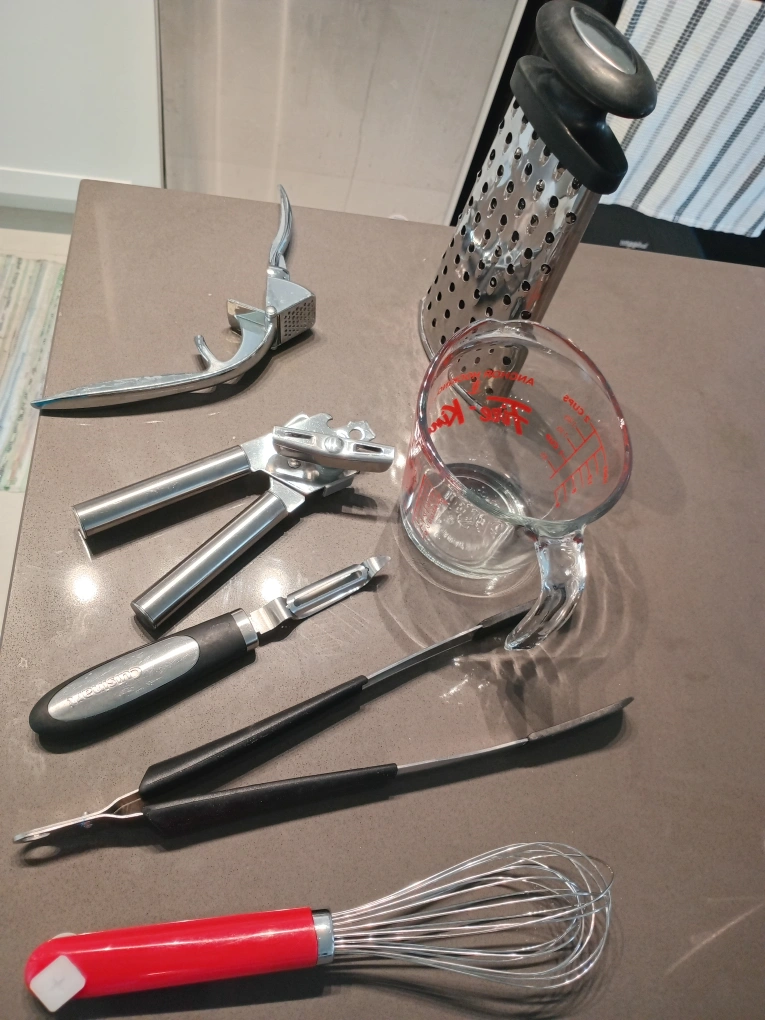 Selling a bundle of kitchen utensils! Includes a garlic press, can opener, vegetable peeler, tongs, whisk, grater, and a measuring cup. Great for anyone setting up a new kitchen or looking to expand their collection