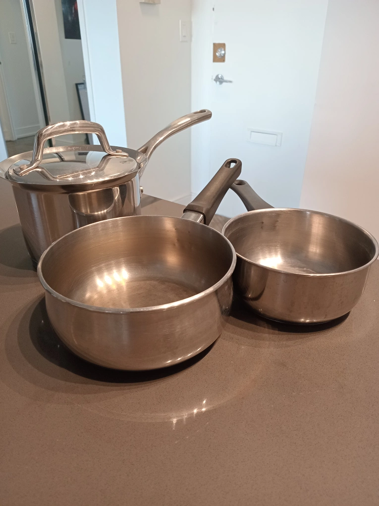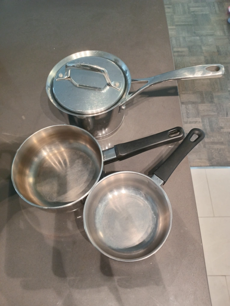 Selling a set of three stainless steel sauce pans. They are in good condition and ready for a new home. Great for cooking up your favourite sauces or boiling small portions. Perfect for any kitchen!