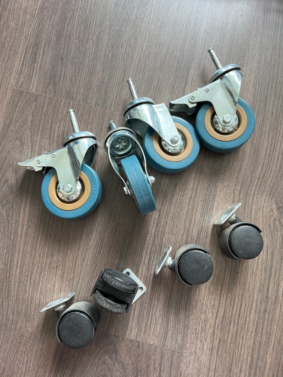 Selling a set of furniture casters and cart wheels. Great for DIY projects or replacing old wheels on your furniture. Blue set brand new 75x21 wheels. Black ones used but still in great shape for your project. Free with purchase (let me know you want these before you come pick up your item) or BEST OFFER