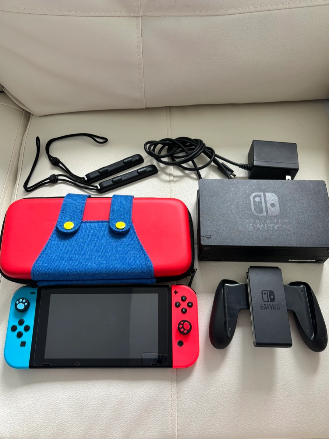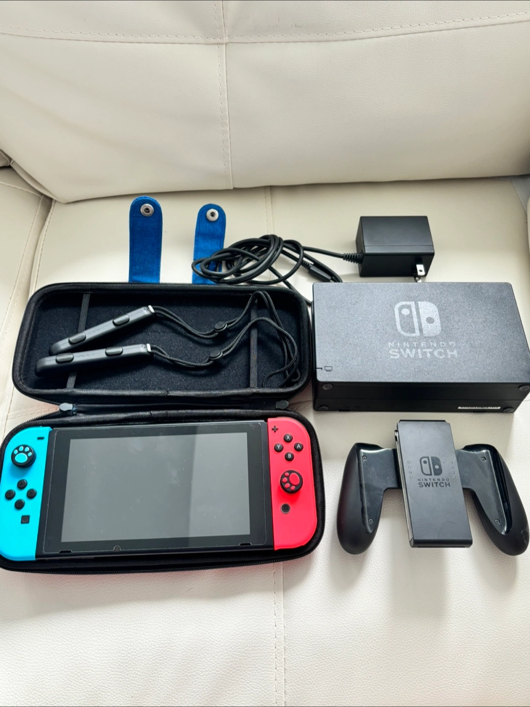 It comes with all the accessories you see in the pictures, including the dock, Joy-Con controllers, and charger.