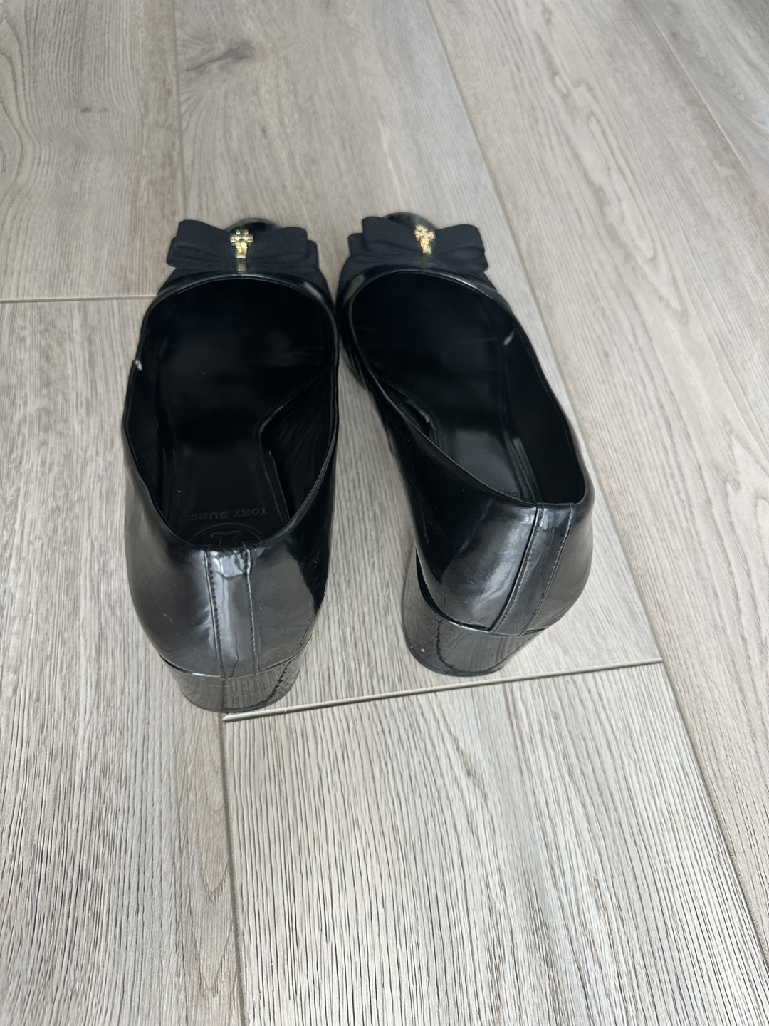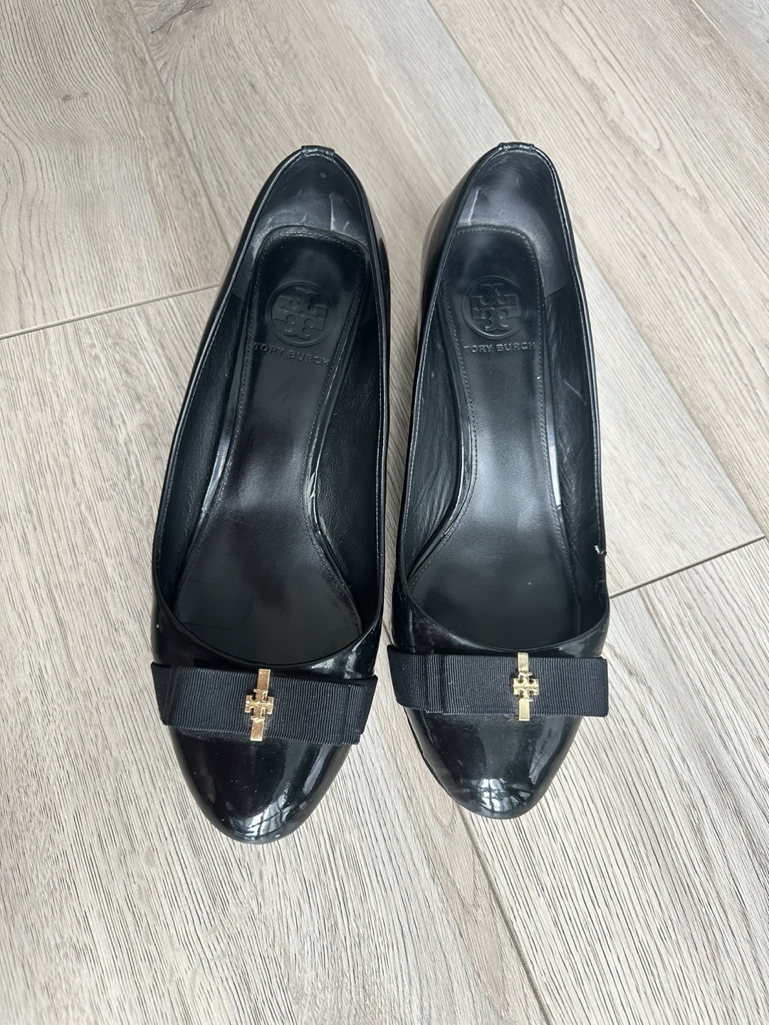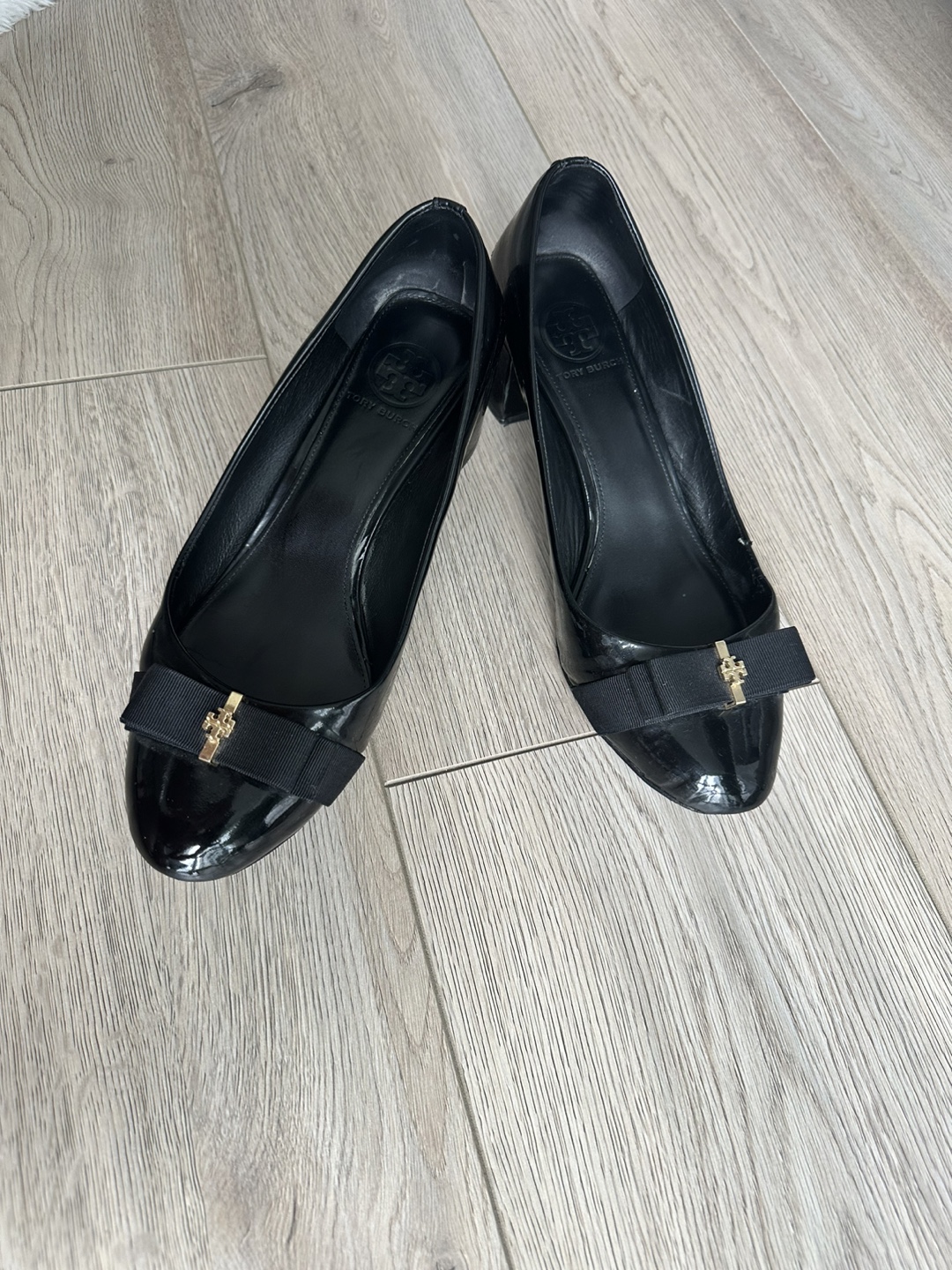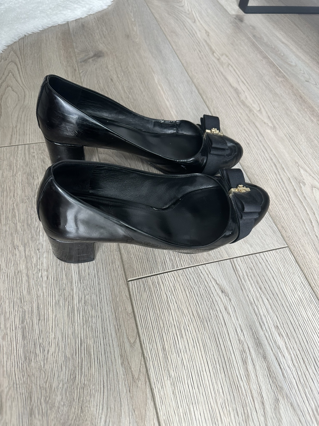 Selling a pair of Tory Burch black patent leather block heel pumps. They are a size 9M and feature a cute bow detail. Still in good condition and lots of life. Just don't reach these anymore.
