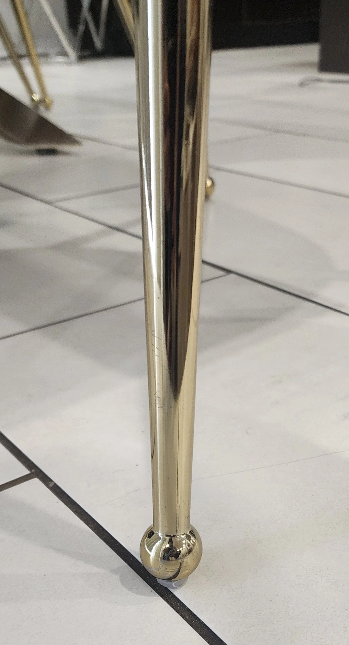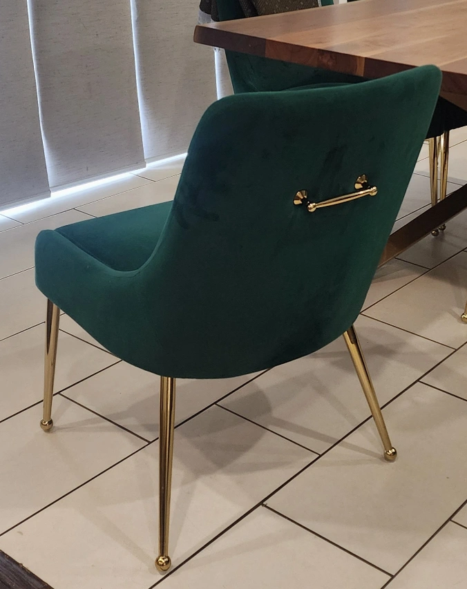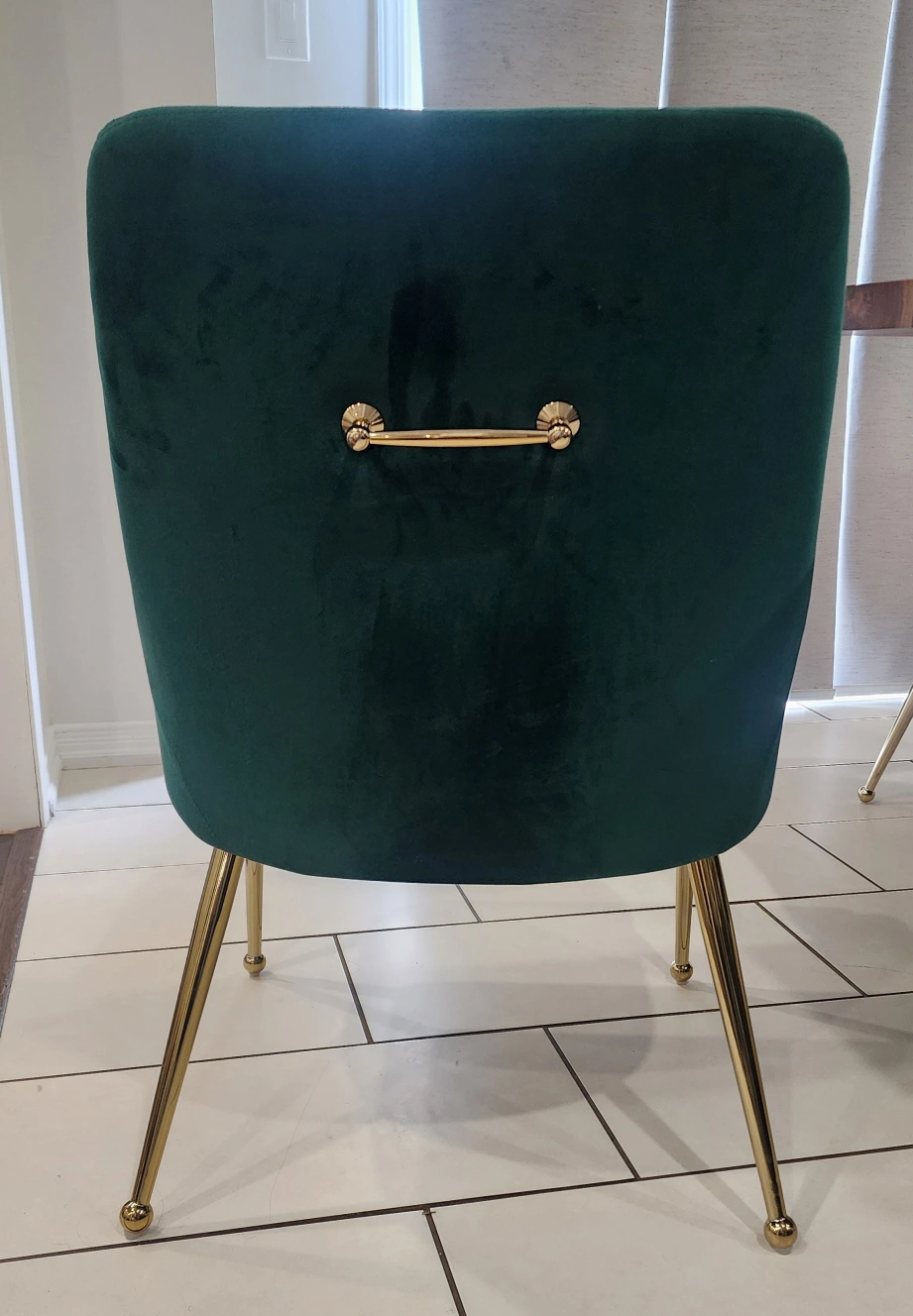 Selling a stylish dining chair featuring a beautiful green velvet upholstery and elegant gold legs. It's in good condition and would add a touch of sophistication to any dining space. There are some minor scratches on the legs.