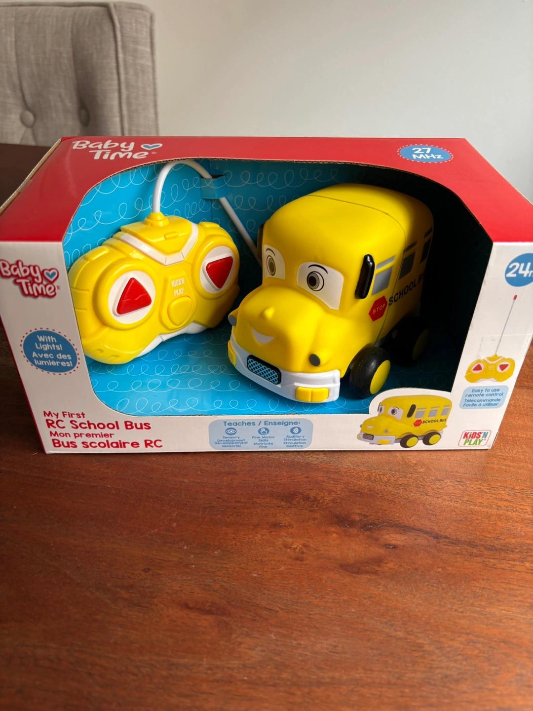 Selling a brand new Baby Time RC School Bus! It's still in its original packaging and includes the remote control. The bus has lights and is easy to use. Perfect for little ones who love vehicles!
