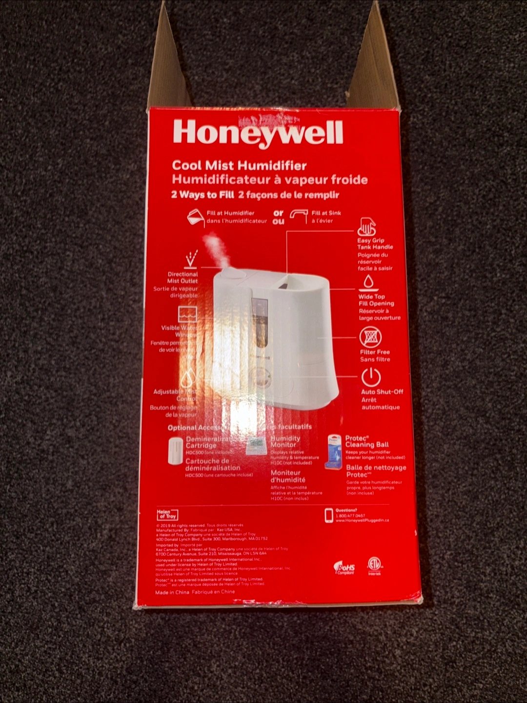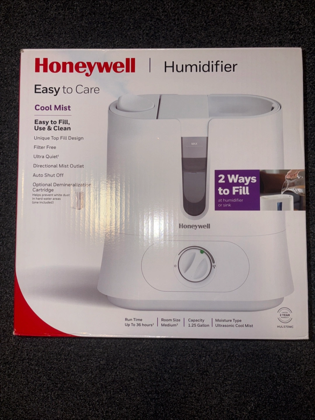 1000+Selling a Honeywell Cool Mist Humidifier. It's easy to fill, use, and clean, with a unique top fill design. It also features a filter-free system, an ultra-quiet operation, and a directional mist outlet. The humidifier has an auto shut-off feature and includes an optional demineralization cartridge to help prevent white dust (one included). Comes with the box as well! Run time is up to 36 hours, with a room size of medium and a capacity of 1.25 gallons
