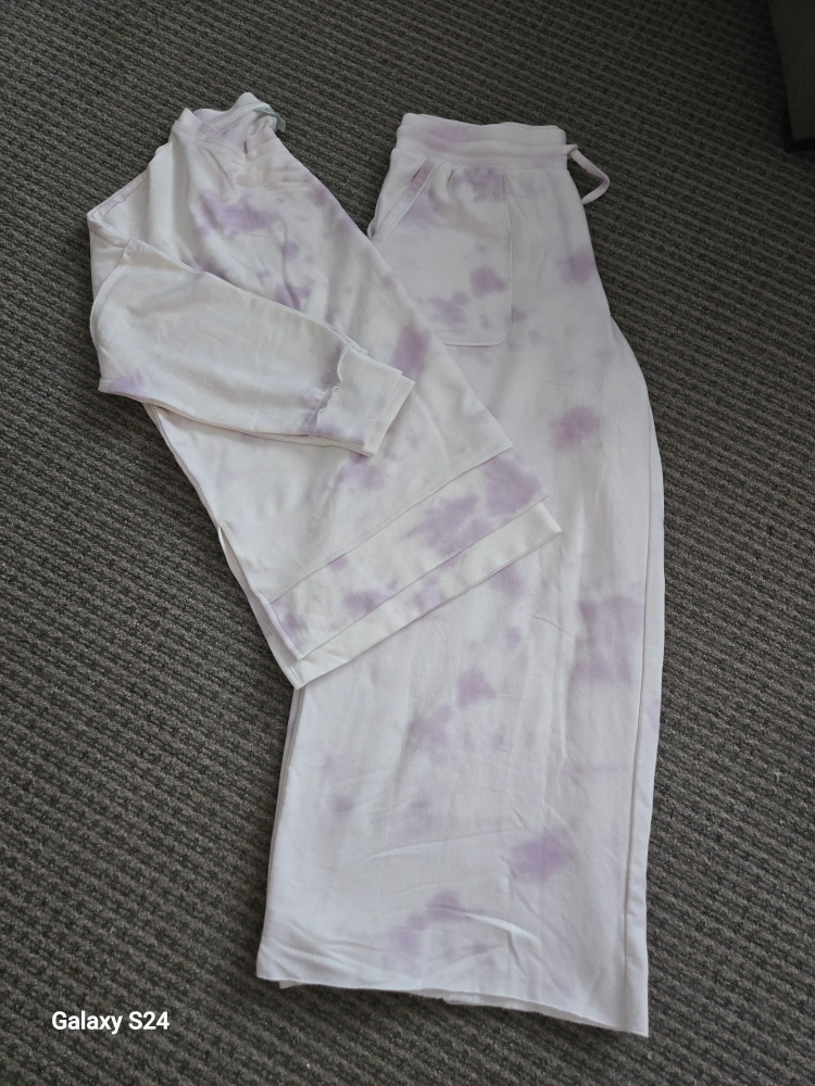 Cozy tie-dye lounge set in a size medium! Perfect for relaxing at home. The material is very soft and comfortable. Size med but fit quite large, very roomy. PU Fort Saskatchewan.