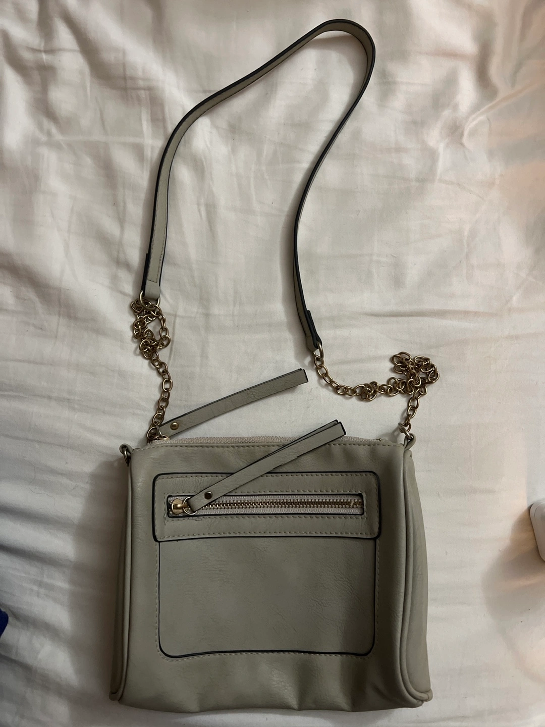 This is a cute grey crossbody bag! It has a gold chain detail on the strap and a zipper pocket on the front. It's in good condition and perfect for everyday use