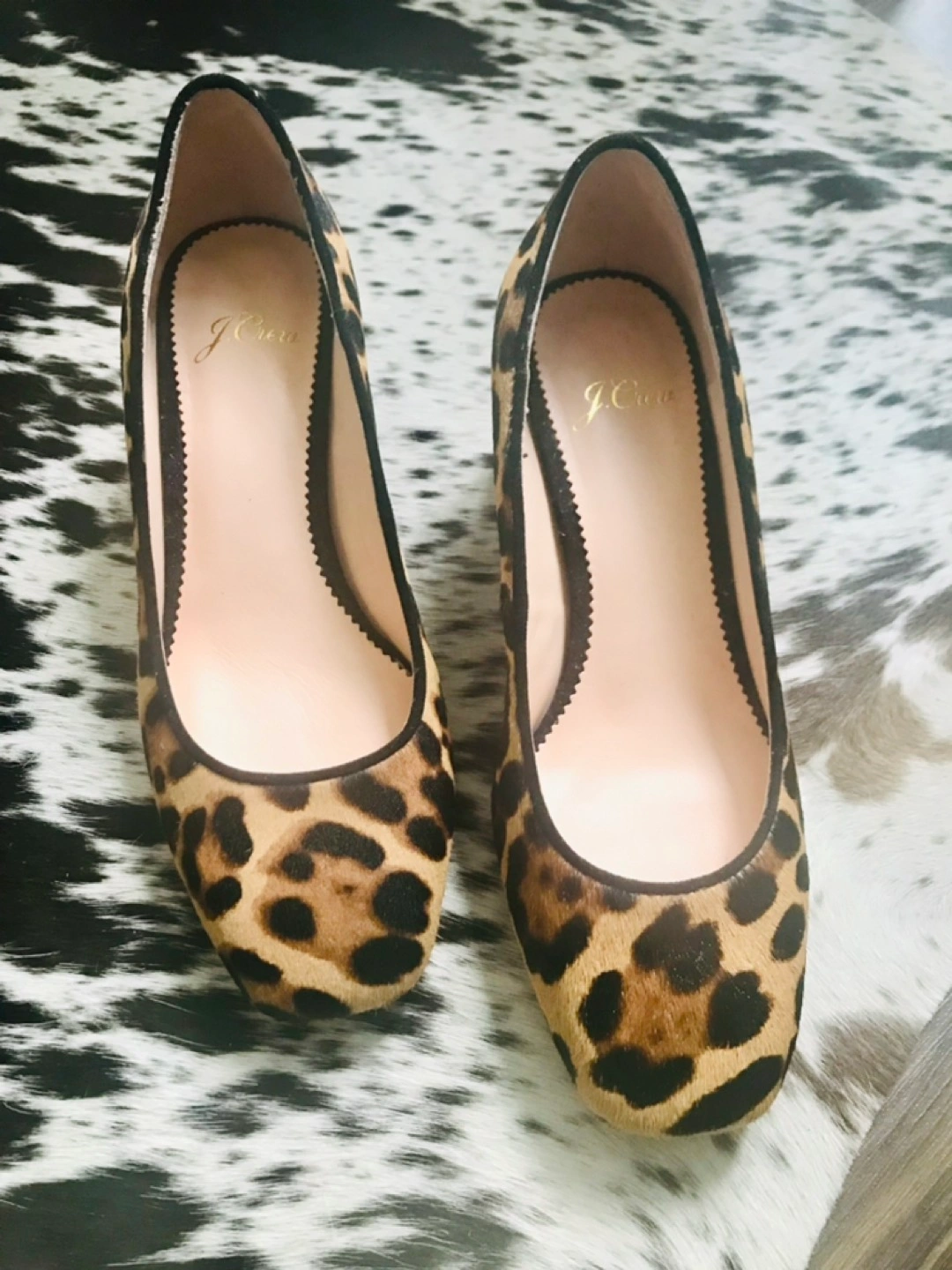 J Crew Women’s, calf-hair leather leopard print, 5cm block heel, round toe, 5.5 US sizing (can fit a narrow 6), padded leather insoles, never worn, comes with box