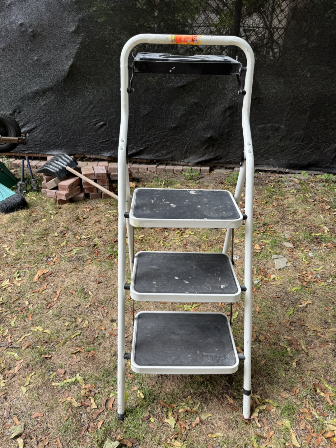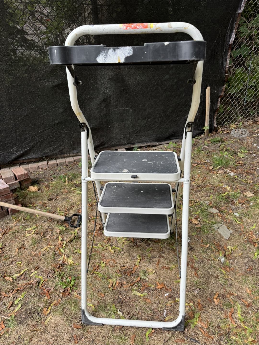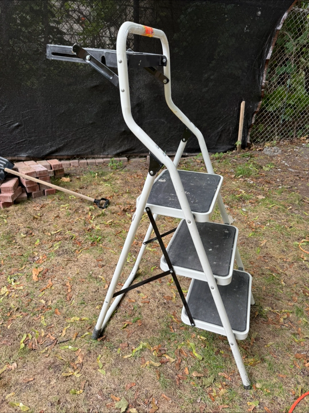 Selling a handy 3-step ladder! It's in good condition and ready to help with all those hard-to-reach places around the house or garden. In good condition. One of the rubber foot covers broke.