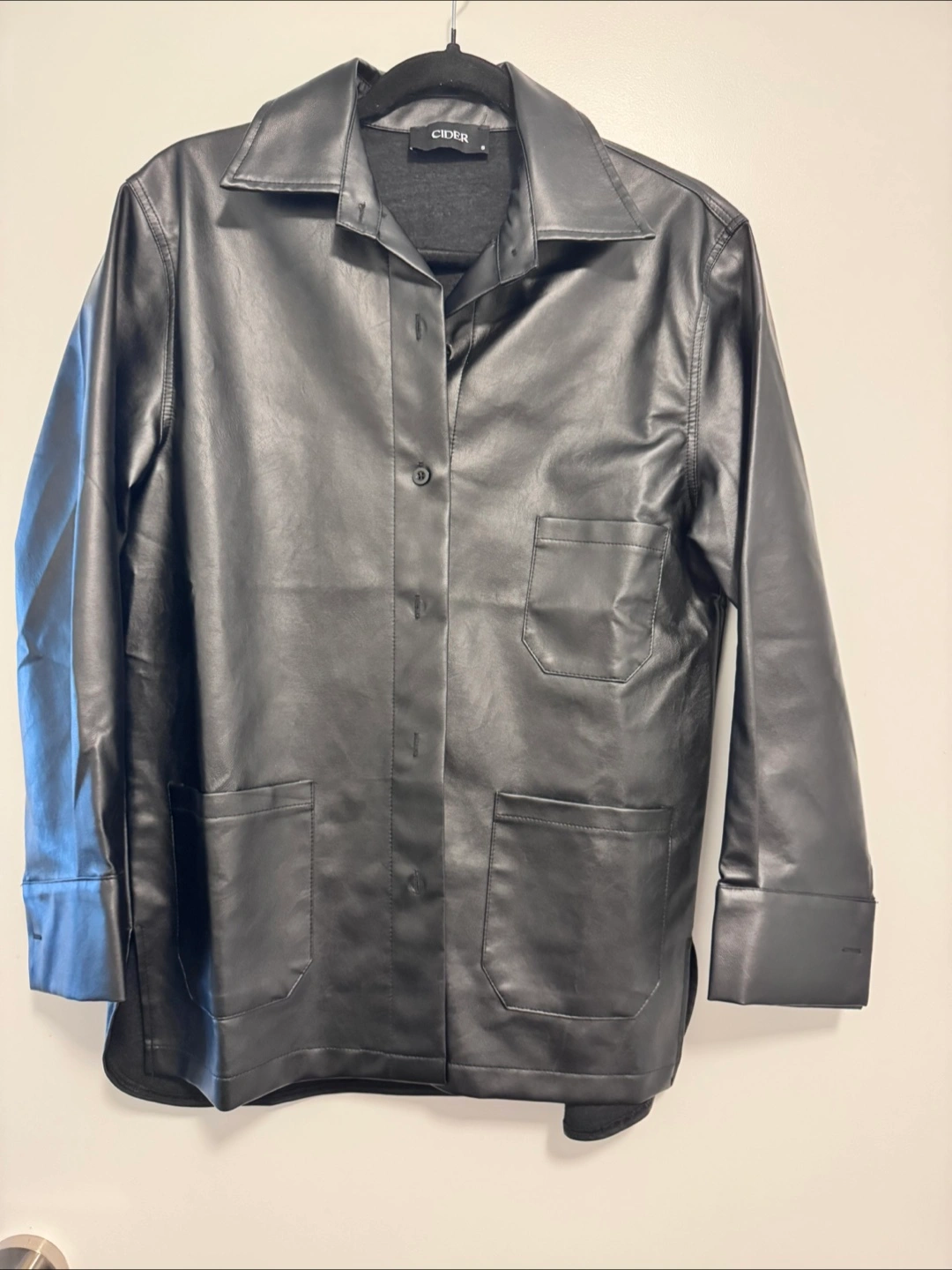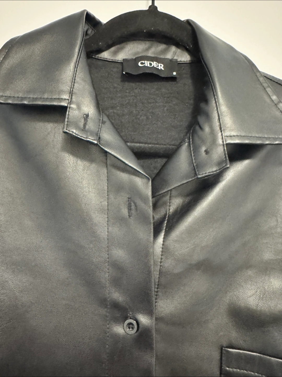 Check out this stylish black faux leather shirt from Cider! It's a size small and in great condition. Perfect for adding a bit of edge to your wardrobe. The material is lightweight and comfortable to wear, making it a great addition to any outfit