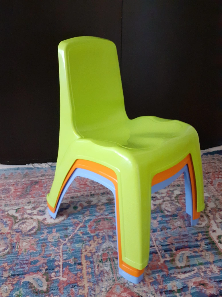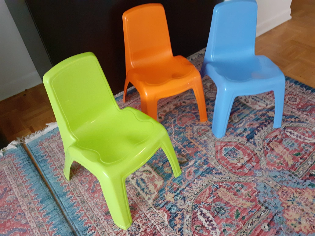 Selling a set of three Rimax plastic kids chairs! These chairs are perfect for toddlers and young children. The set includes one chair in each of the following colours: green, orange, and blue. They are lightweight and easy to move around, making them great for playrooms or classrooms