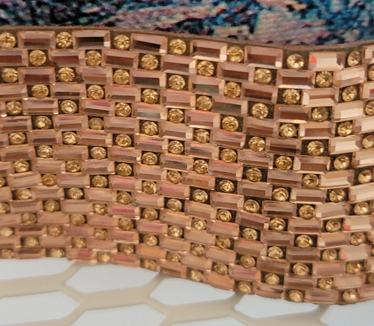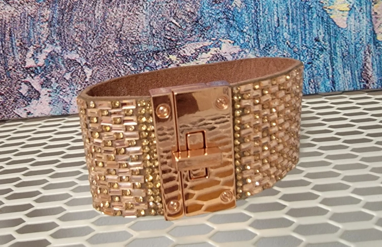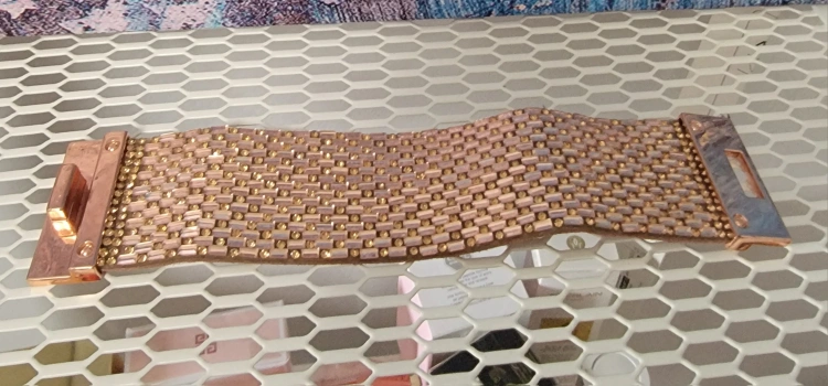 1000+This is a lovely rose gold cuff bracelet. It features a lattice design with small gold accents. It's in great condition and would be a nice addition to any jewellery collection