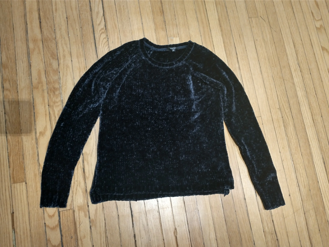 Blueish black sweater with a knitted texture, uniquely coloured, it's kind of shiny