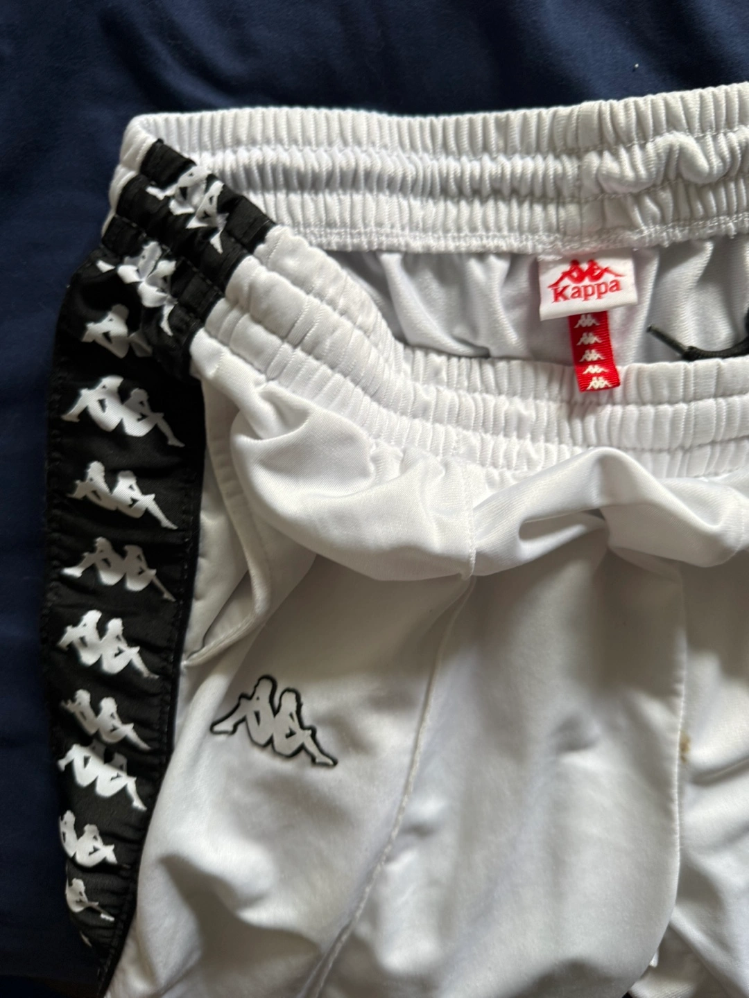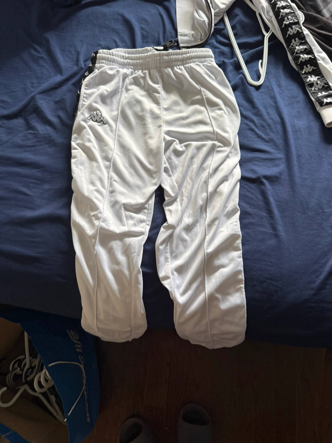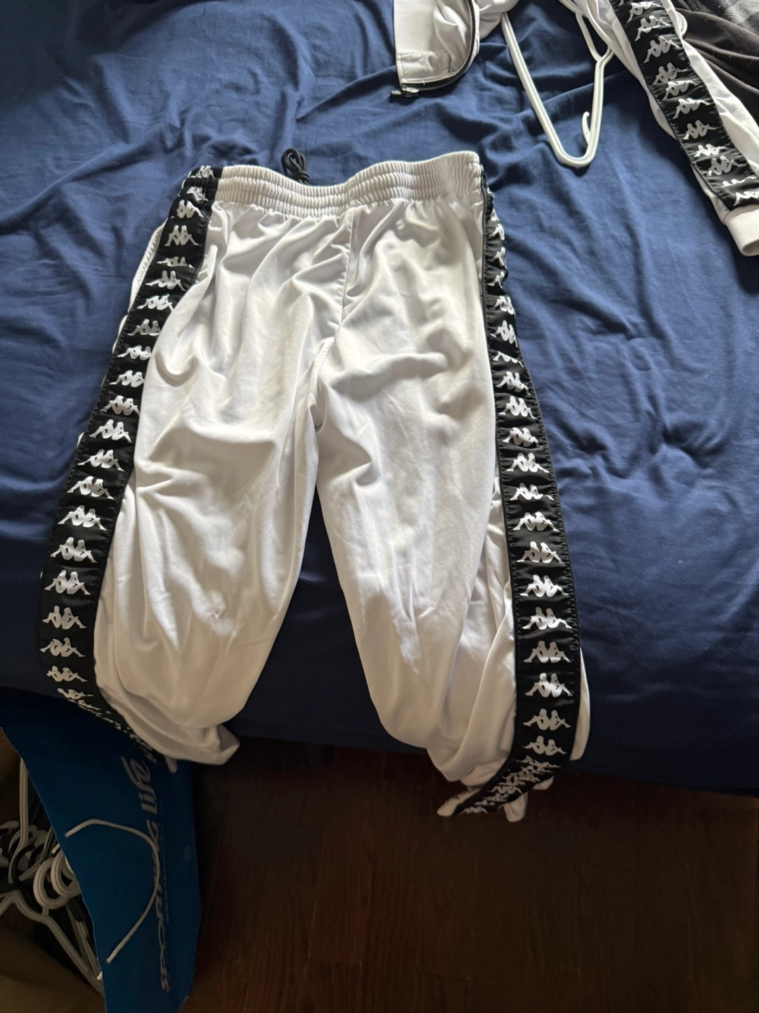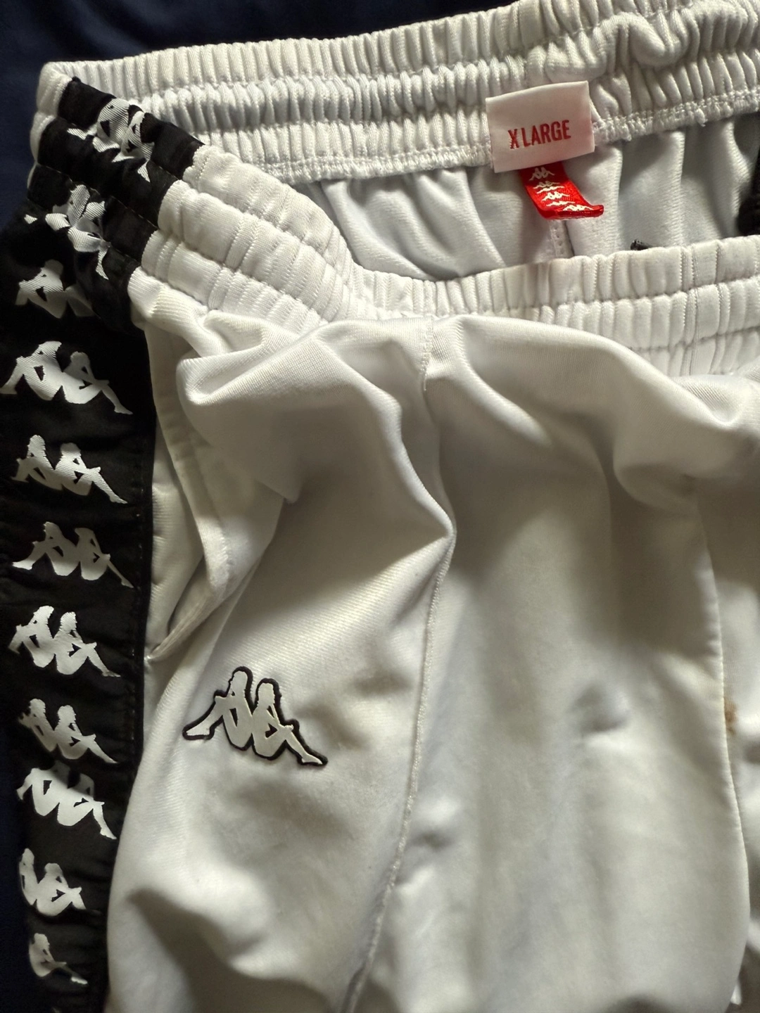 These Kappa track pants are in great shape and ready for a new home! They're a size X Large and feature the classic Kappa logo down the sides. The pants are white with black accents. Perfect for lounging or hitting the gym!