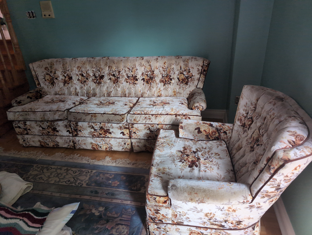 Selling a floral sofa and armchair set. The set has a vintage design with a cream base and brown floral pattern. There are some signs of wear, but overall it's in good condition for its age.