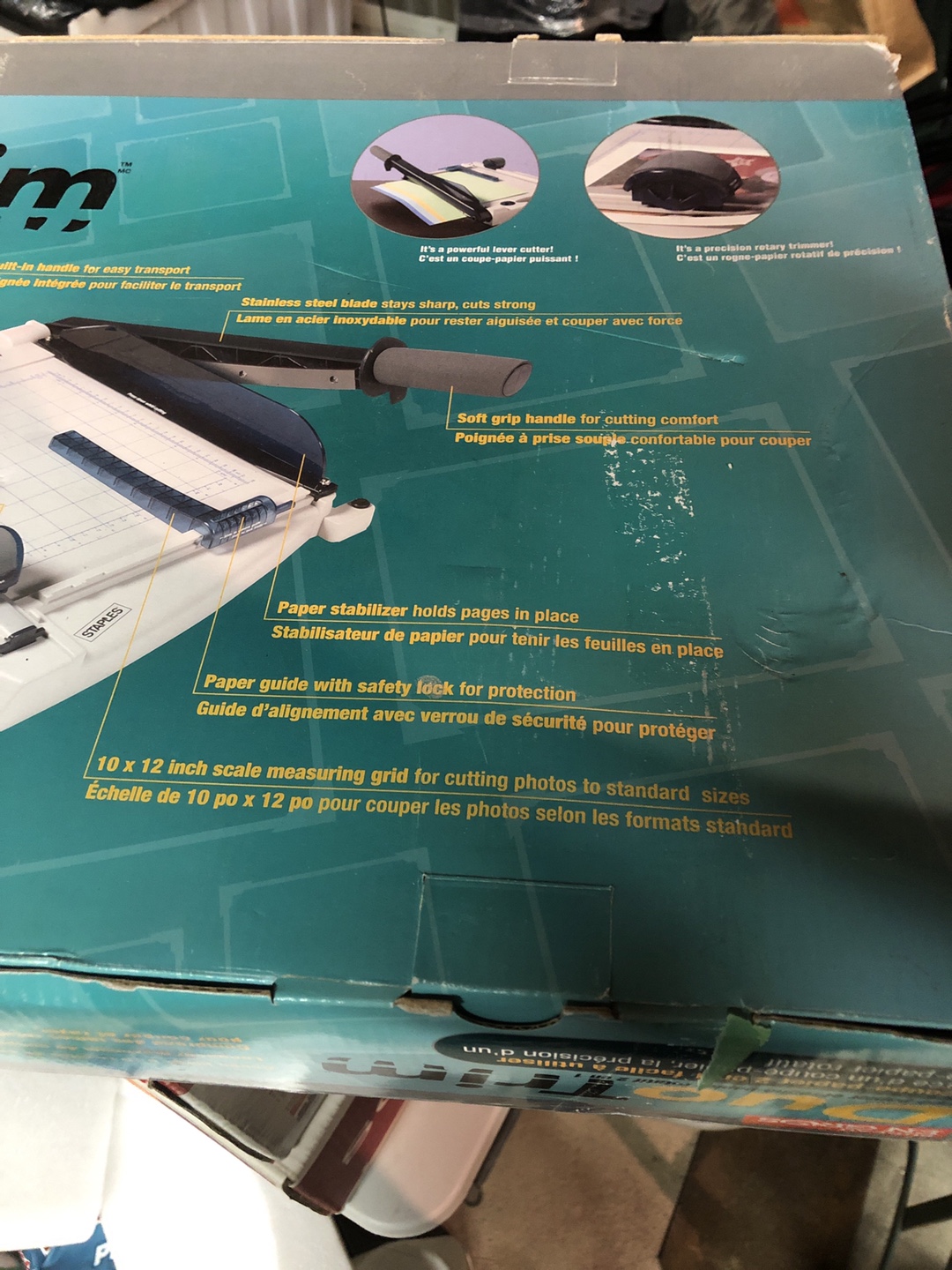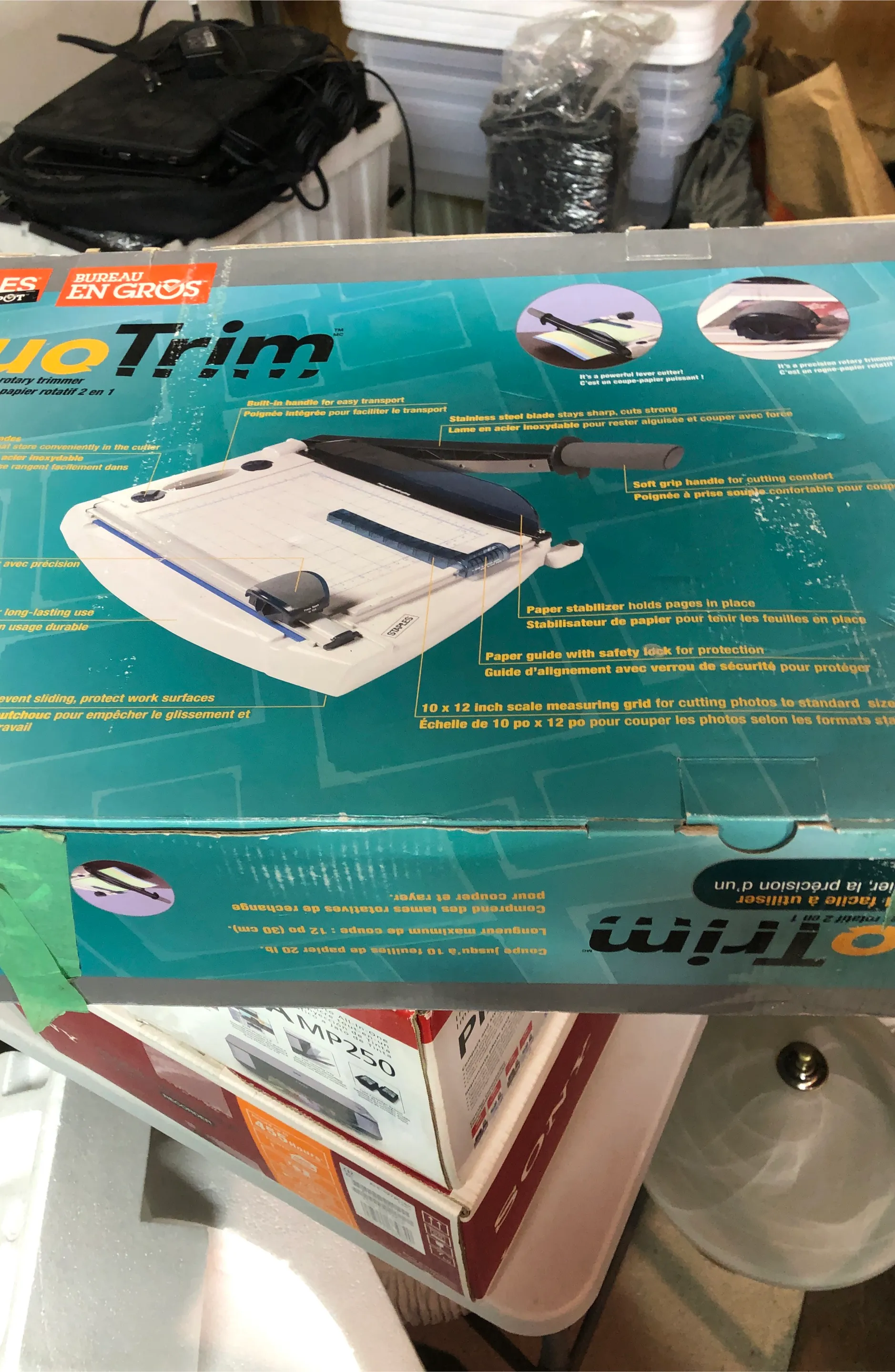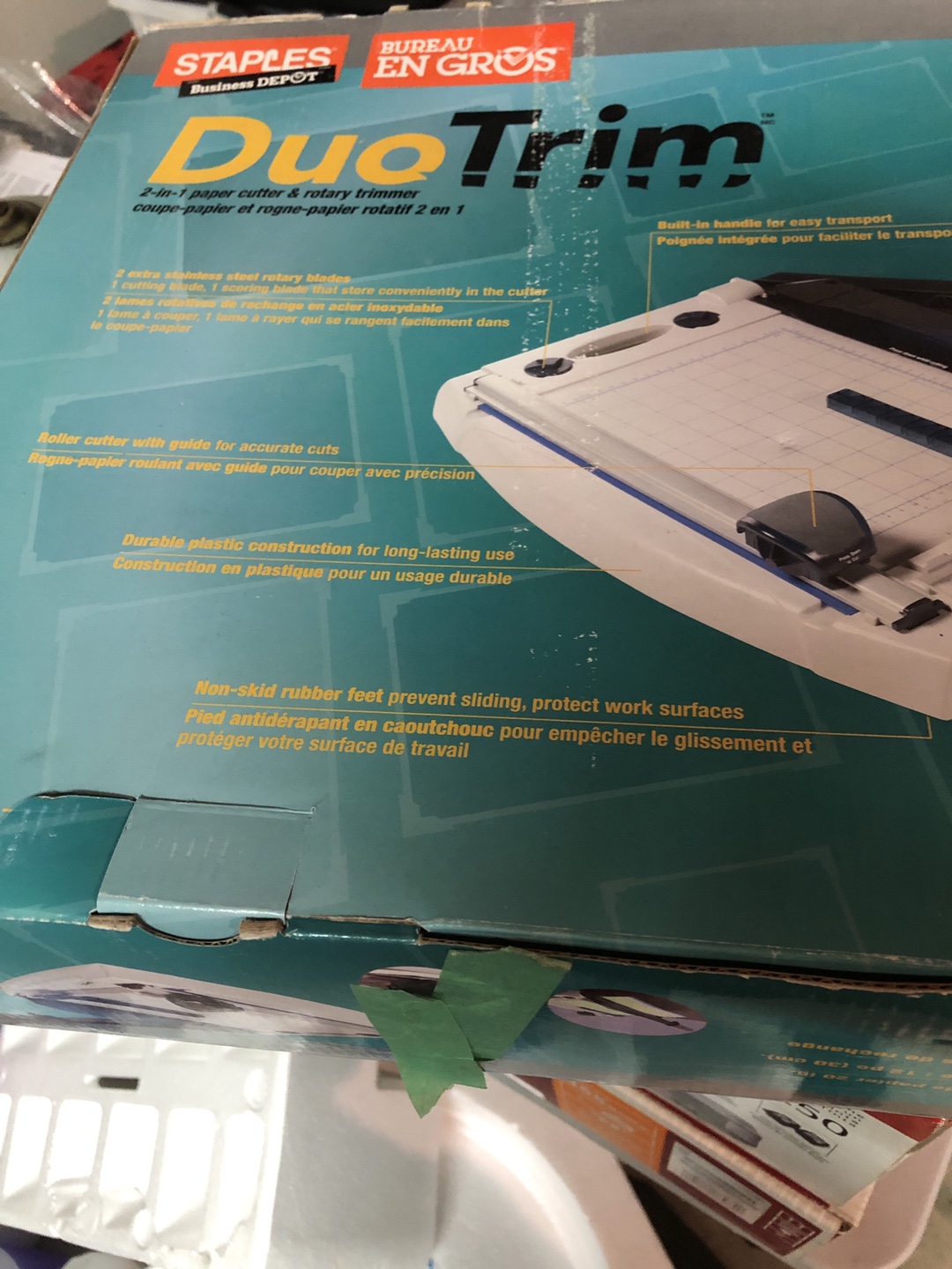 Selling a Staples DuoTrim 2-in-1 paper cutter and rotary trimmer. It has a built-in handle for easy transport and non-skid rubber feet to prevent sliding. The stainless steel blade stays sharp and strong. It also has a soft grip handle for cutting comfort