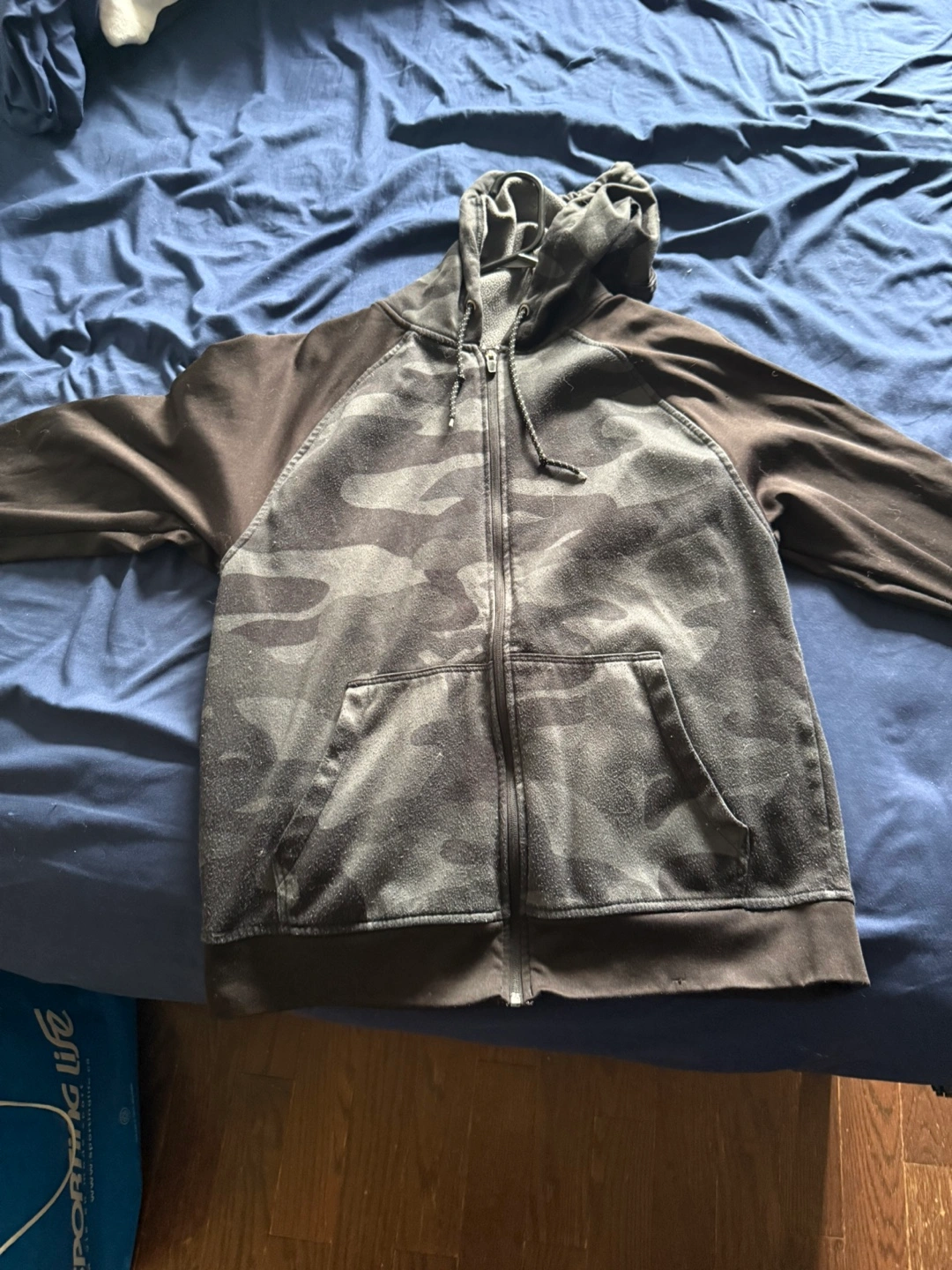 Selling a pair of ACX Active black track pants with a drawstring. They have a sporty design with a logo on the front. Also includes a black and grey camo hoodie. Both in great condition!