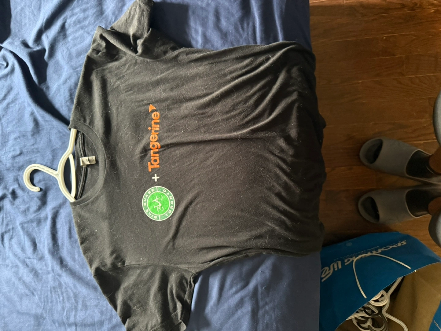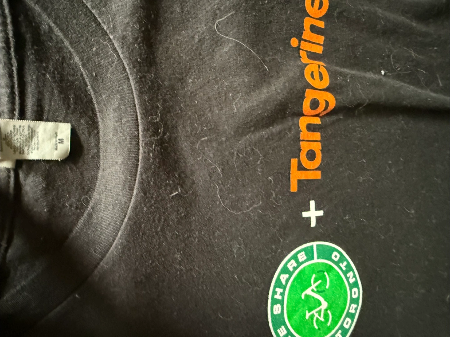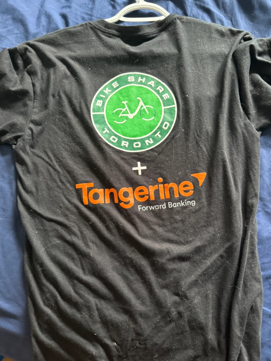Selling a black T-shirt featuring the Bike Share Toronto and Tangerine logos. It's a size medium and in good condition. Perfect for anyone who loves biking in the city or is a fan of Tangerine!