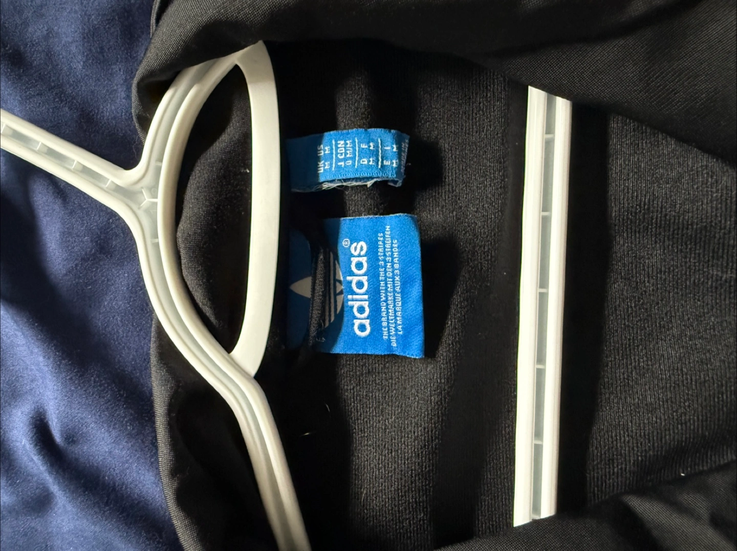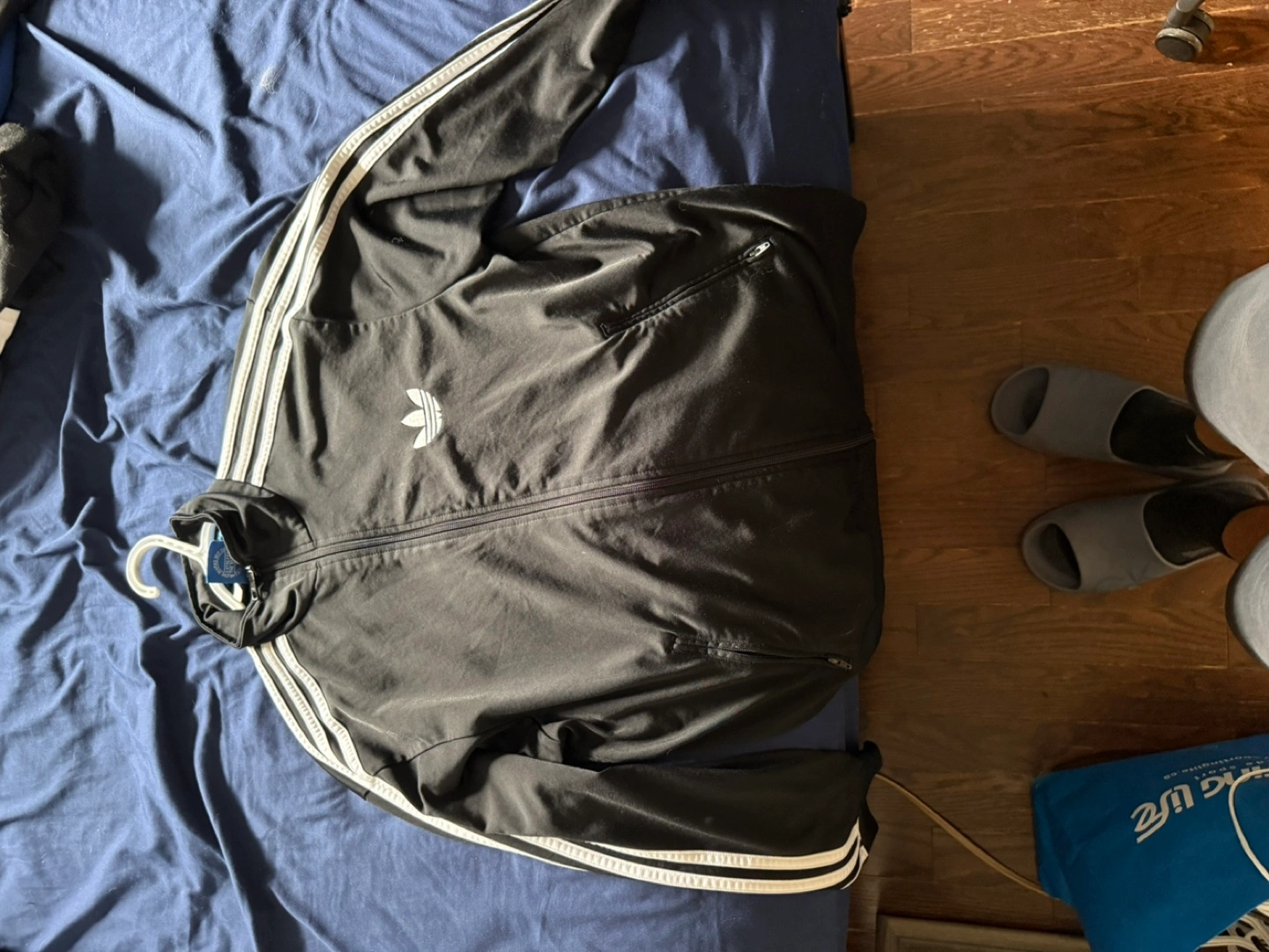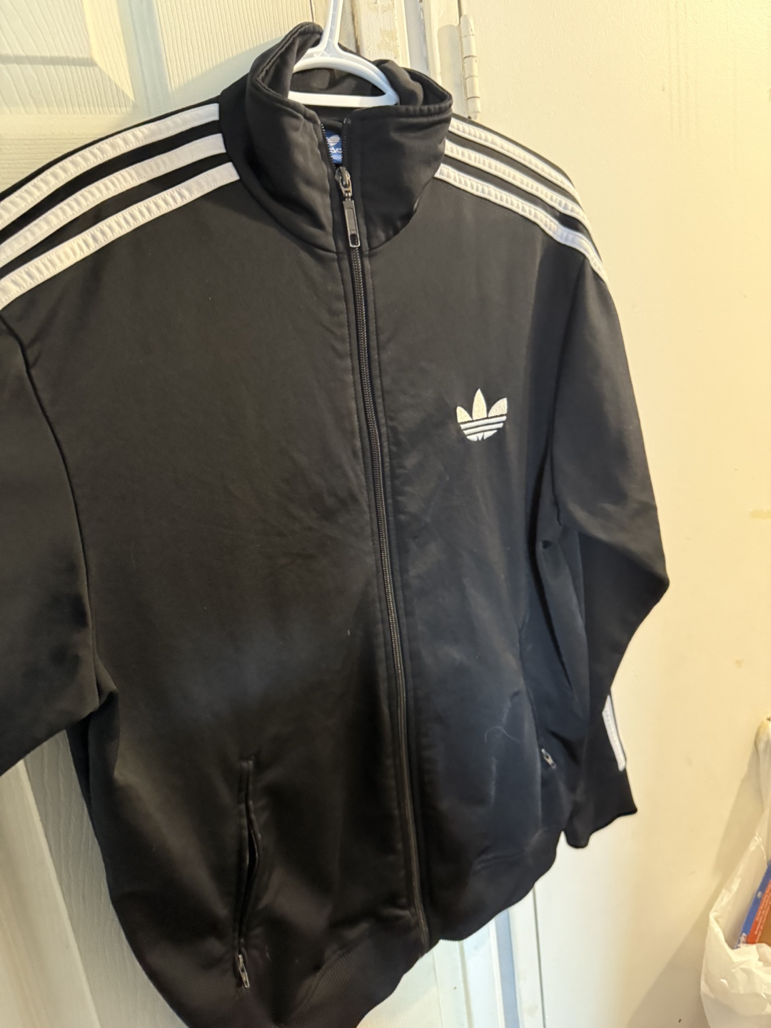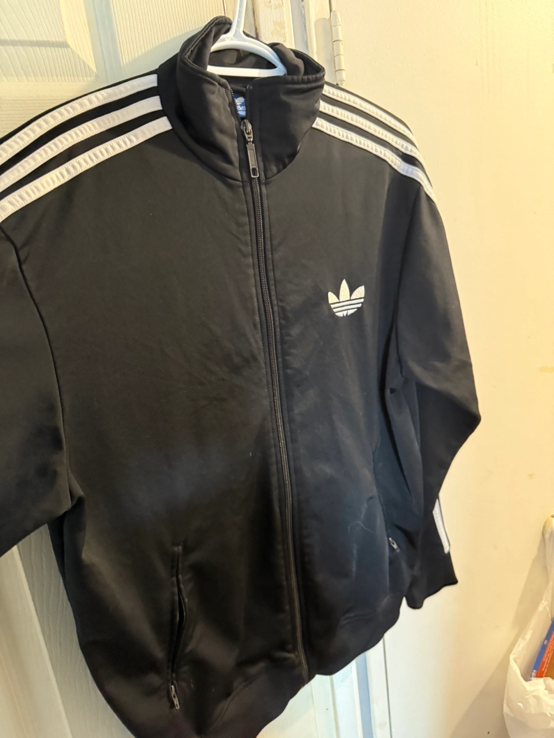 Selling a classic Adidas black track jacket! It features the iconic three stripes on the sleeves and the Adidas logo on the chest. Perfect for workouts or just a casual look! Feel free to reach out if you have any questions or want to arrange a pick-up!