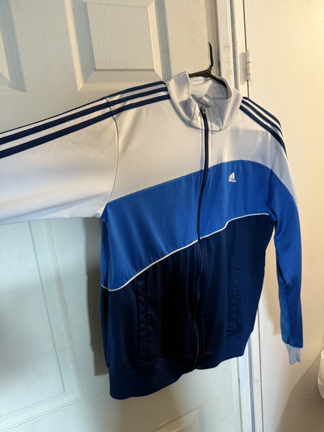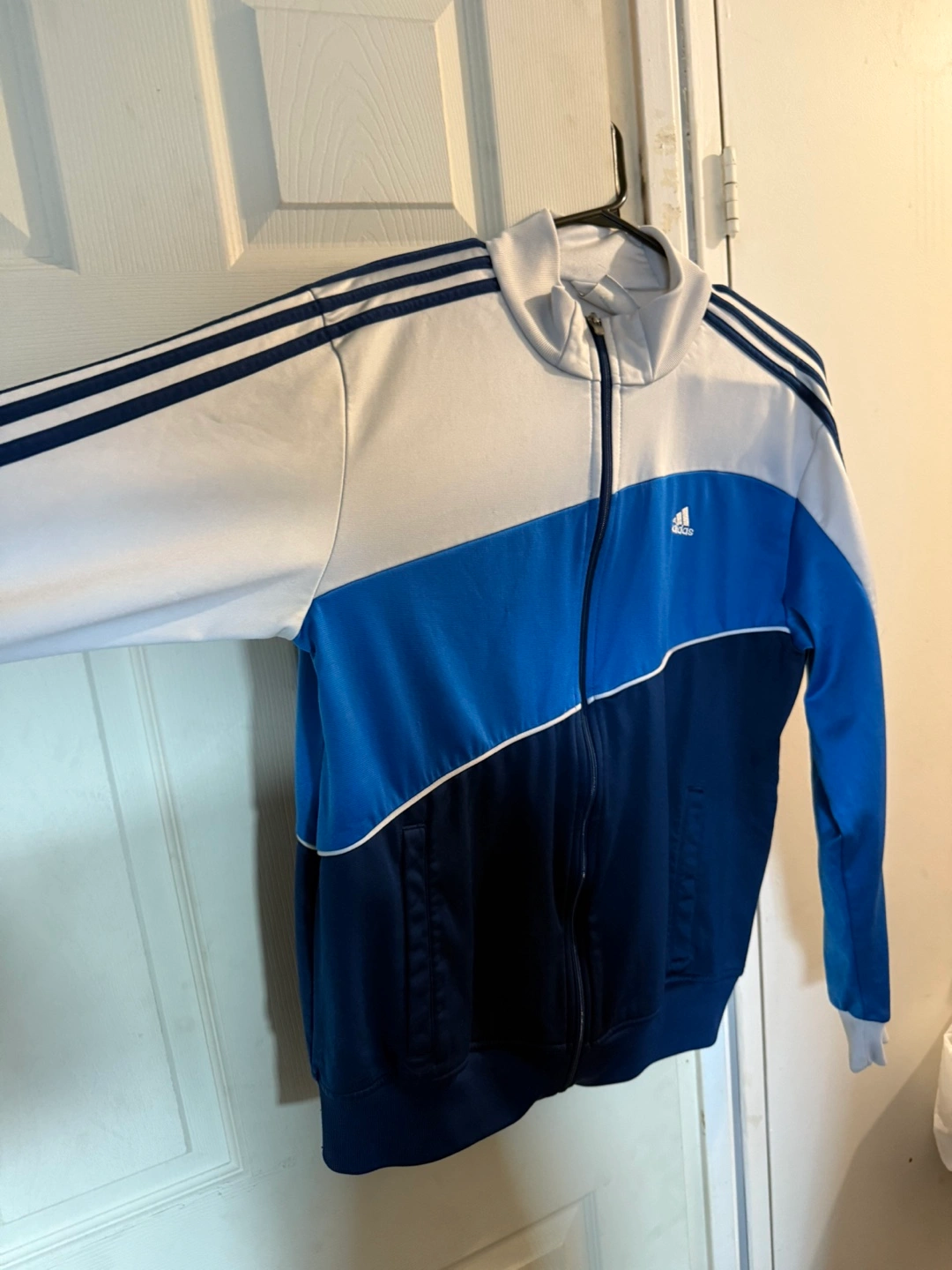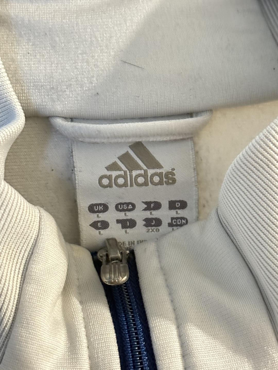 Here's a cool Adidas track jacket in blue and white! It's a size L, perfect for layering or wearing on its own. The classic Adidas stripes add a sporty touch to any outfit Feel free to reach out if you have any questions or want to arrange a pick-up!
