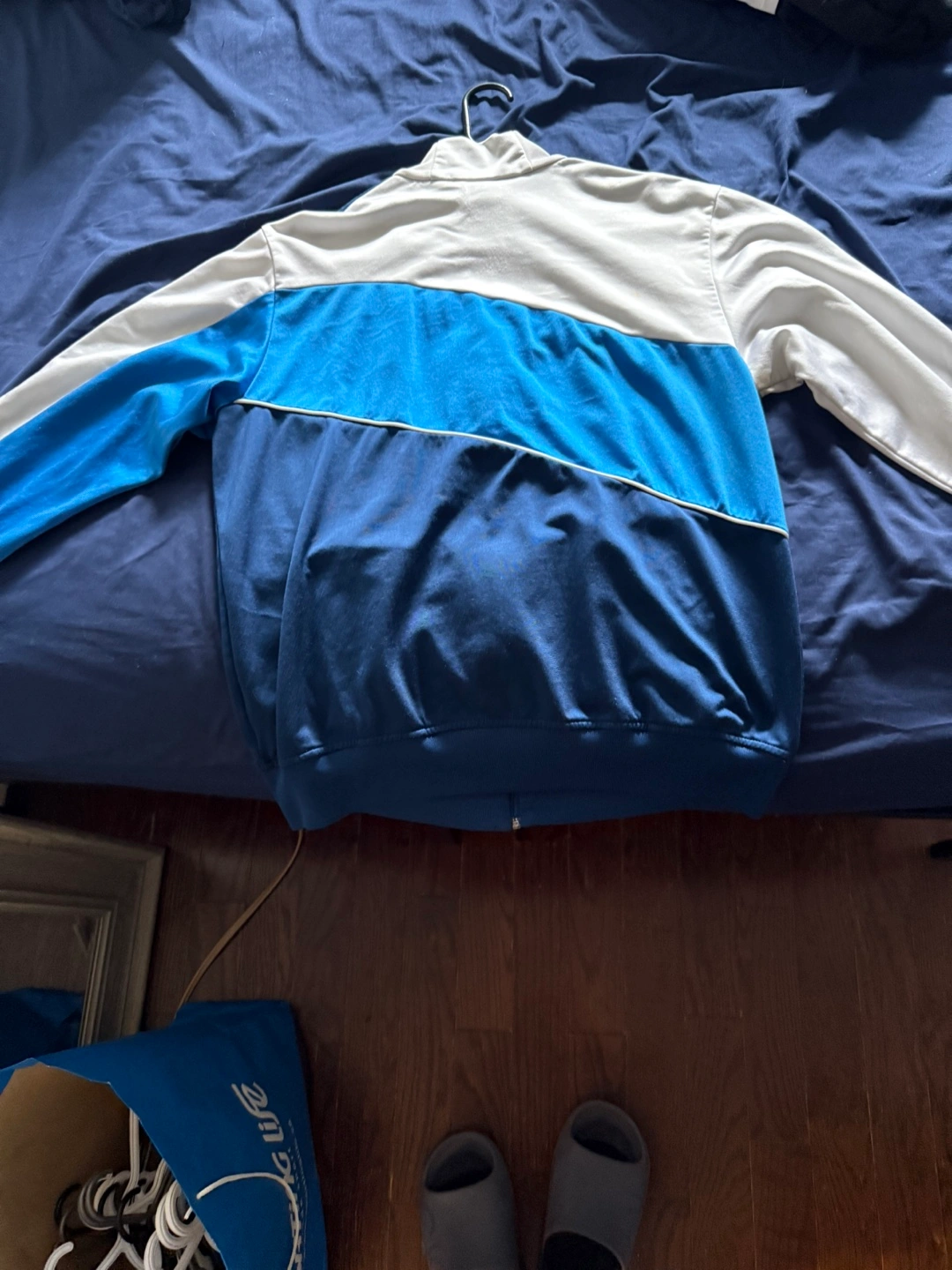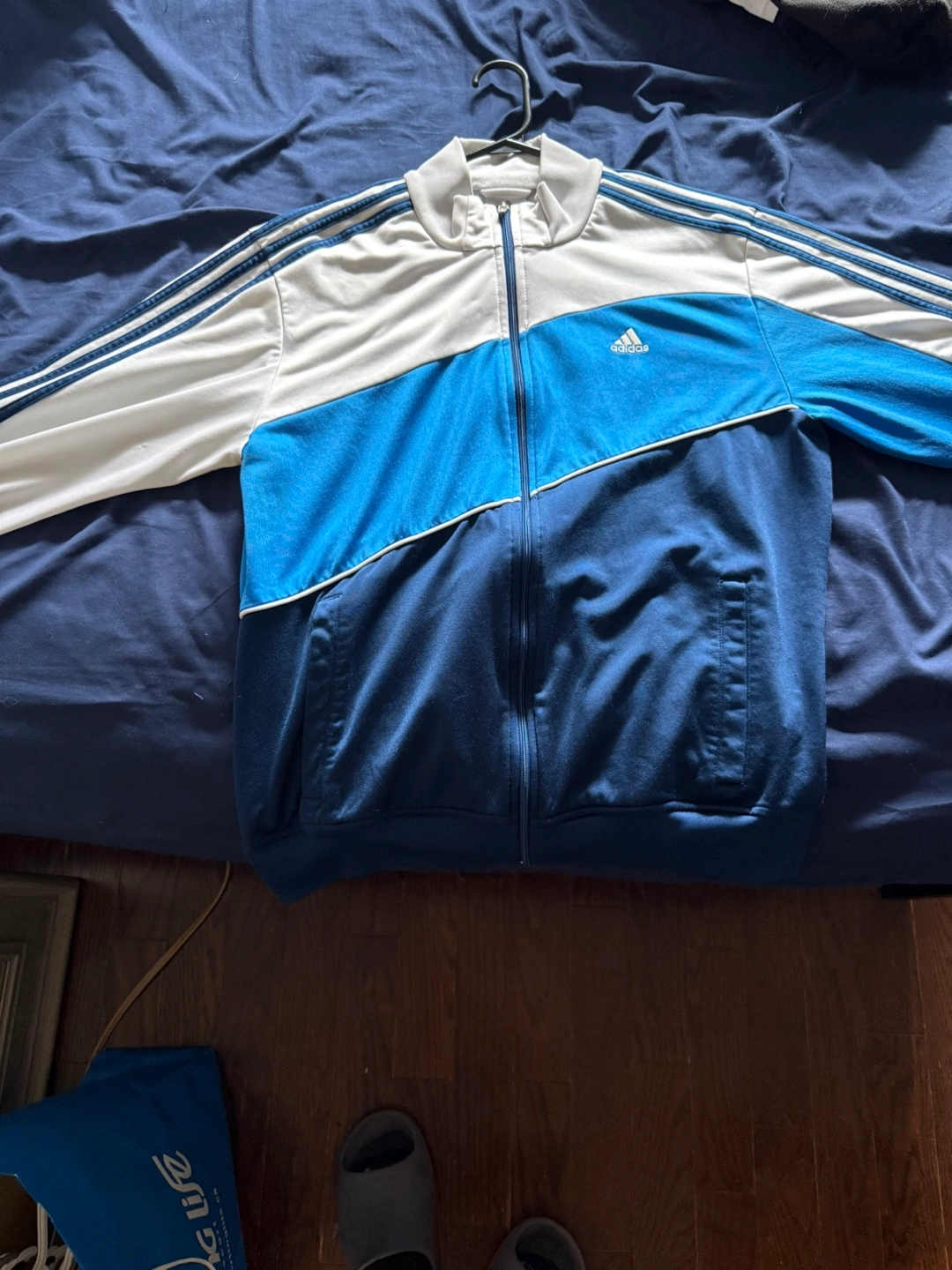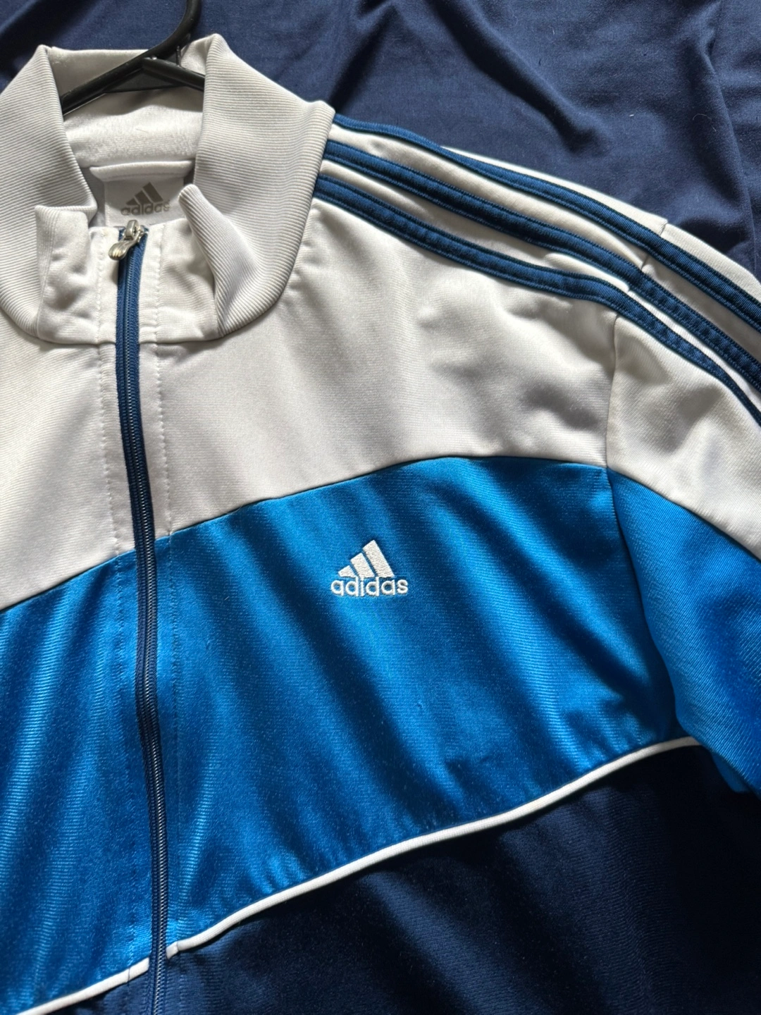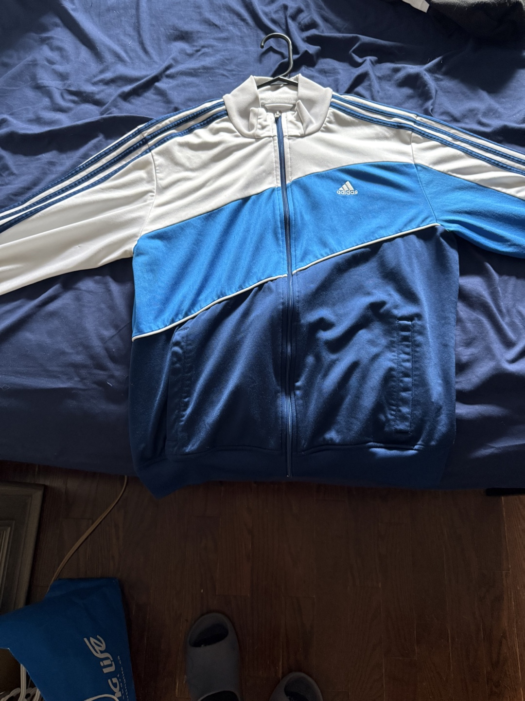Here's a cool Adidas track jacket in blue and white! It's a size L, perfect for layering or wearing on its own. The classic Adidas stripes add a sporty touch to any outfit Feel free to reach out if you have any questions or want to arrange a pick-up!