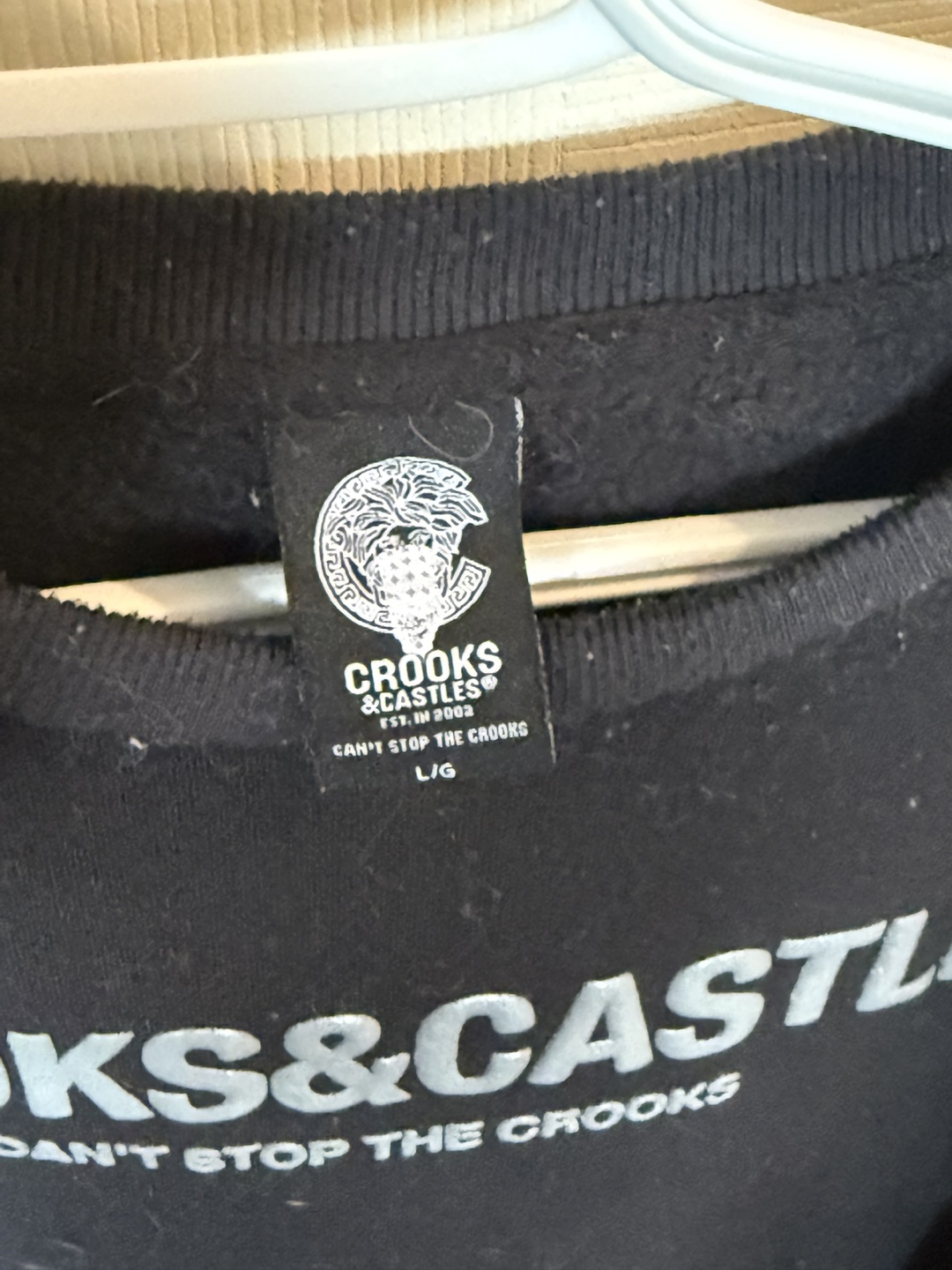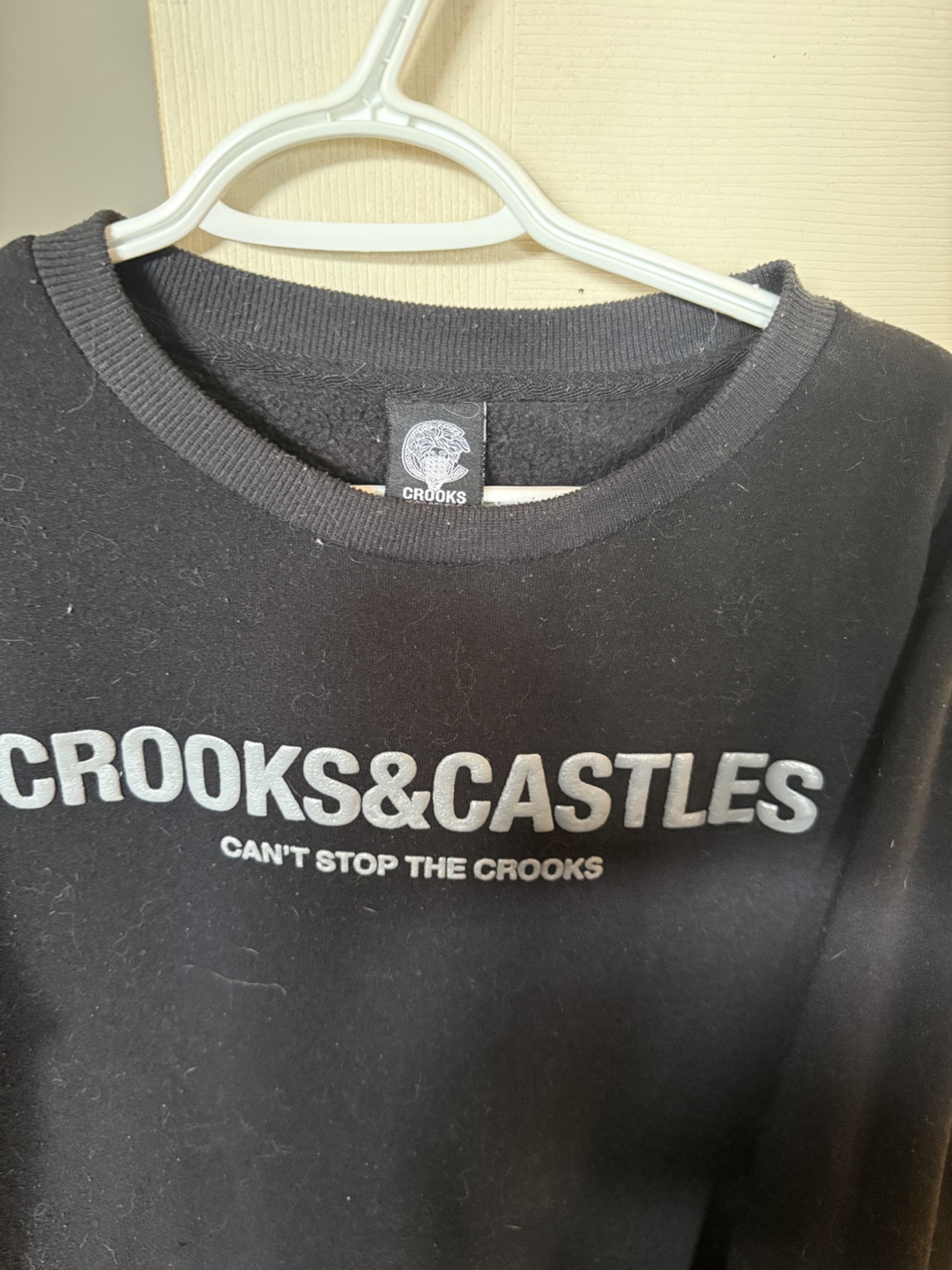 Selling a Crooks & Castles sweatshirt in black. It's a size L and features the "CAN'T STOP THE CROOKS" design. The material is soft and comfortable, perfect for everyday wear!