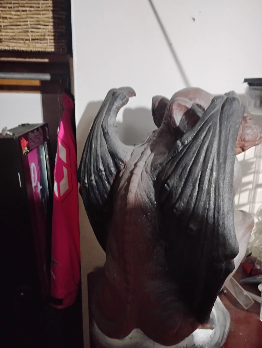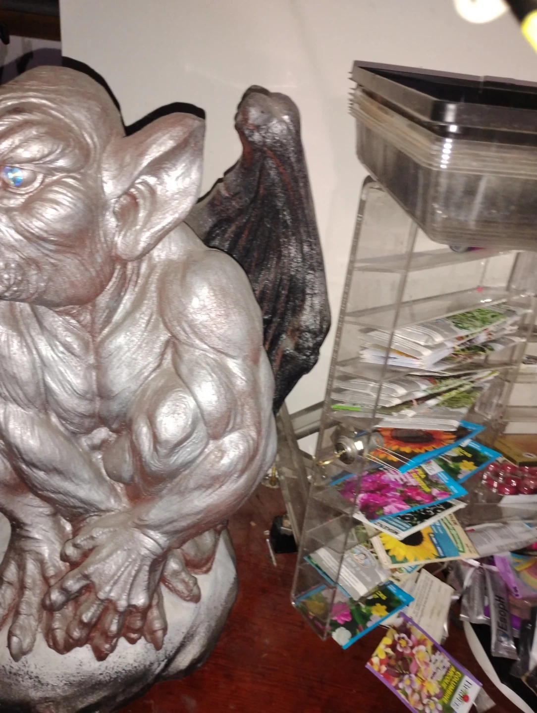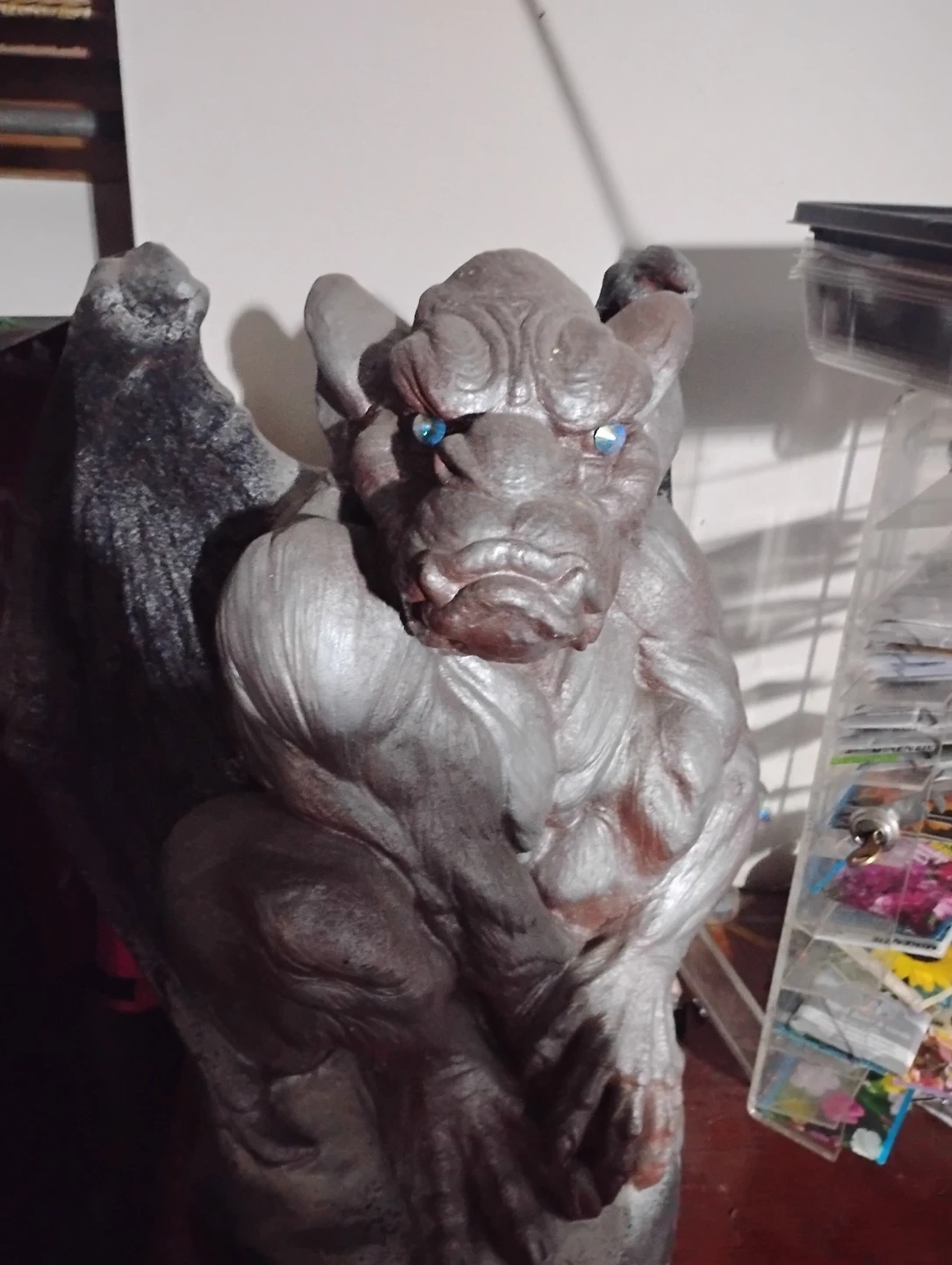 This is a detailed gargoyle statue with blue eyes and large wings. It's made of a durable material, perfect for outdoor display. This statue would make a striking addition to any garden or patio!