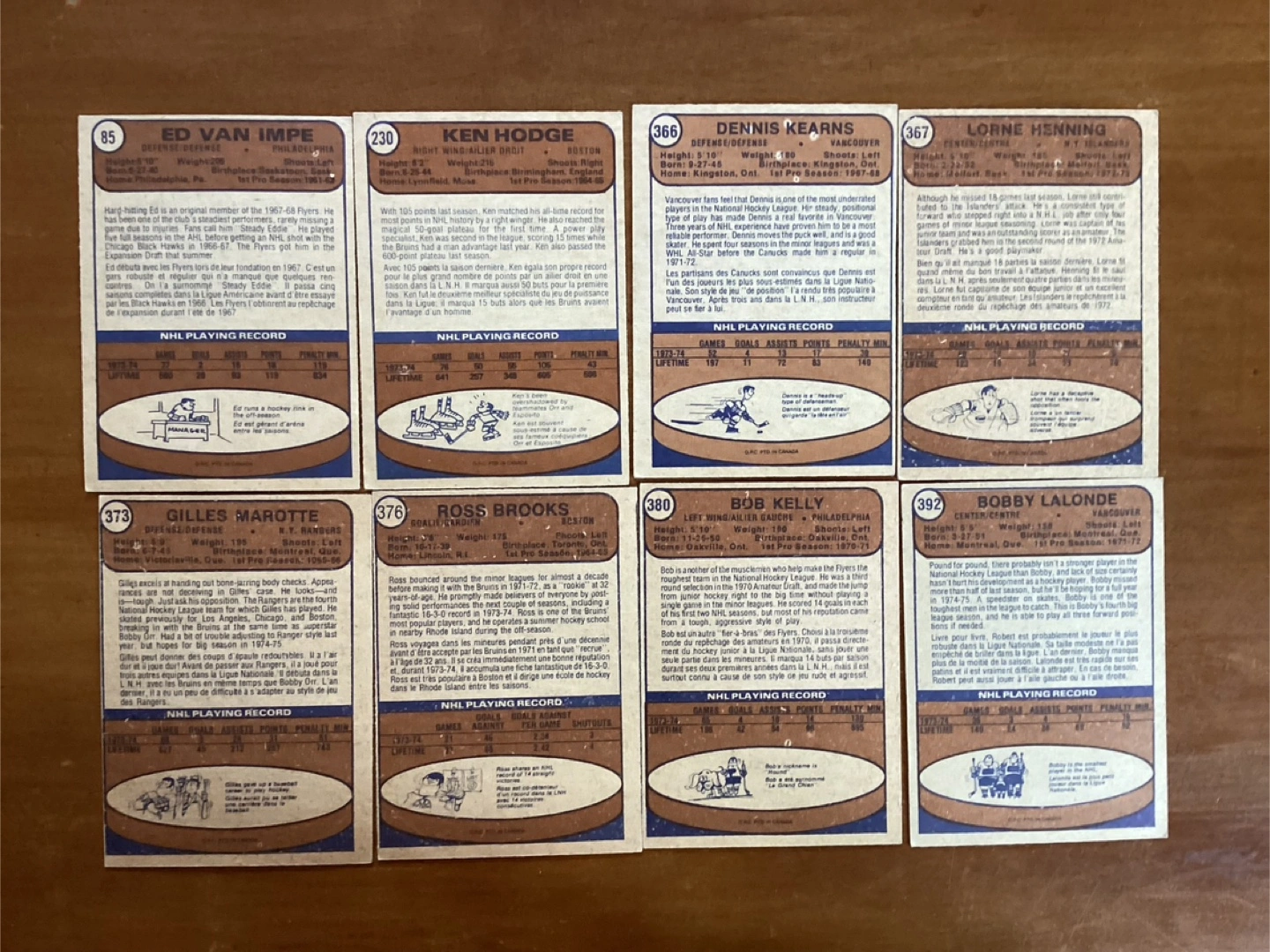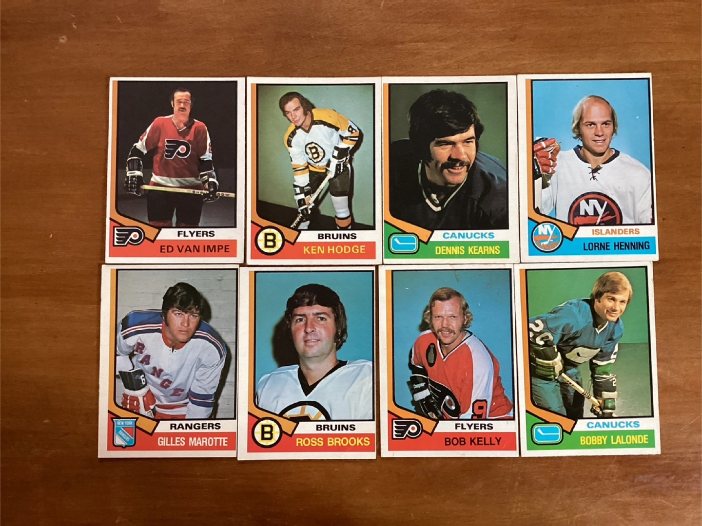 $15.00 for all 8 cards - ED VAN IMPE, KEN HODGE, DENNIS KEARNS, LORNE HENNING, GILLES MAROTTE, ROSS BROOKS, BOB KELLY, BOBBY LALONDE - Shipping available - Located at Pape ave & Cosburn ave Toronto - Call Patrick @ 416-930-8338. - Thanks & check out my other posts
