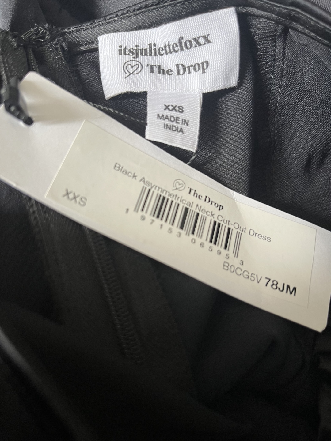 Beautiful black asymmetrical neck cut-out dress from itsjuliettefoxx. It's a size XXS and in great condition! Perfect for a night out or a special occasion. Made in India