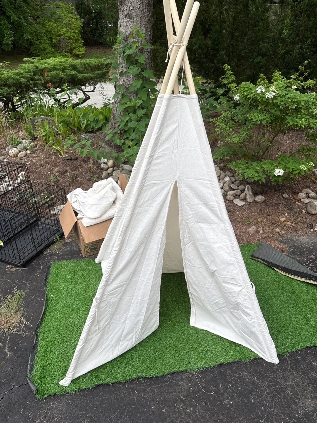 Selling a cute teepee tent for kids! It's in great shape and perfect for indoor or outdoor play. The canvas is a nice, neutral white colour that will fit in with any decor. Comes with the poles and canvas covering, ready for fun adventures! I have three available!
