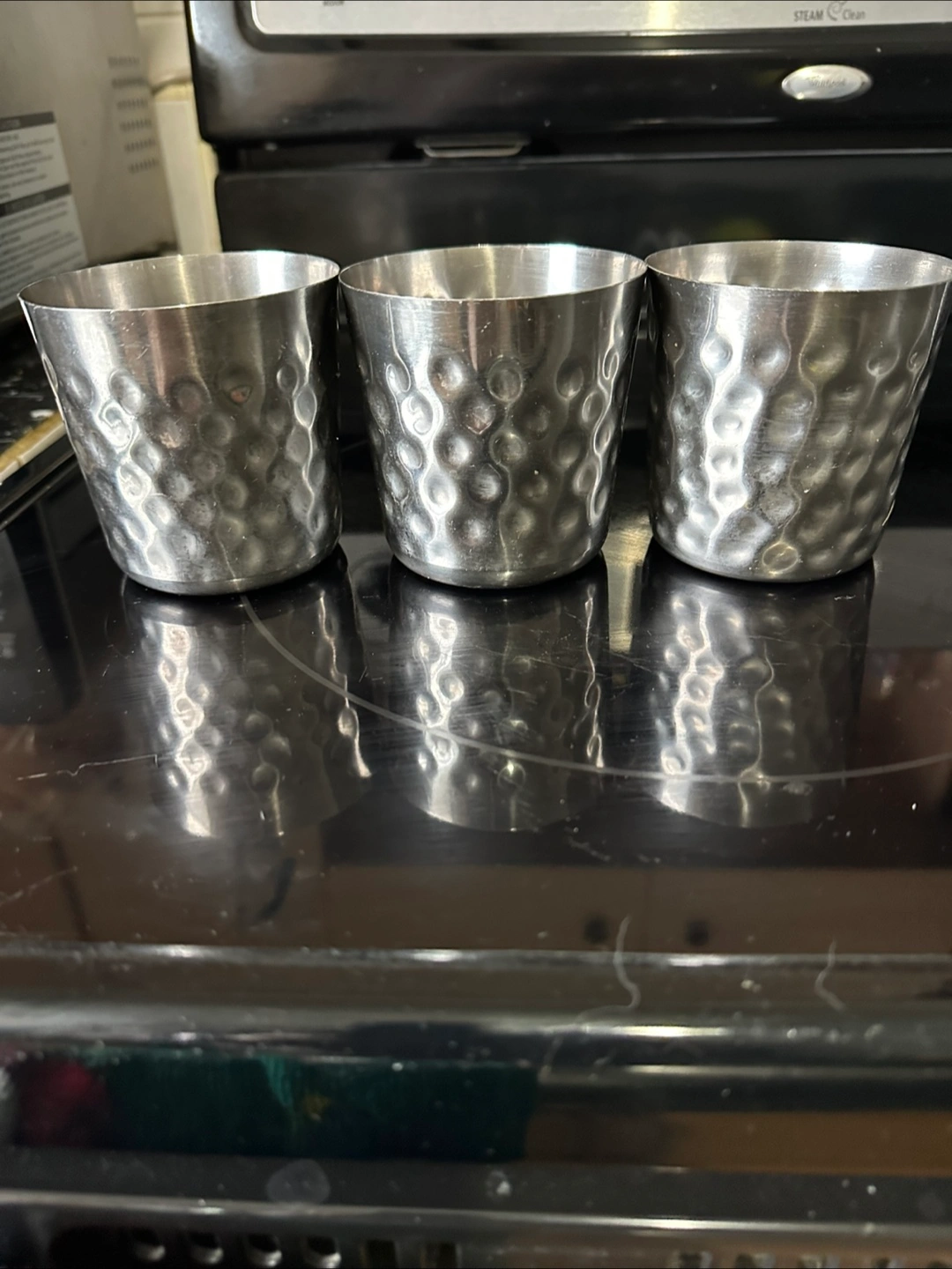 Selling a set of three stainless steel cups. They have a hammered texture on the outside. Great for serving yummy sides like fries, wedges or onion rings. Smoke free home.