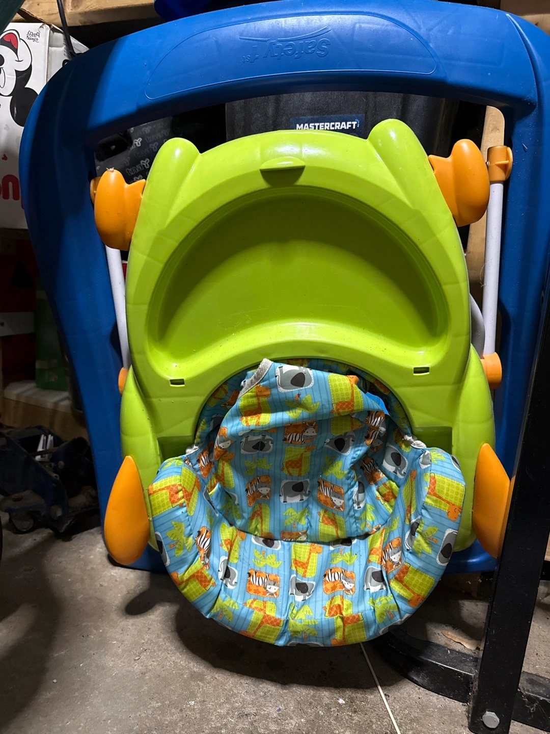 Selling a Safety 1st baby walker! It's in great condition and ready for a new home. The seat has a fun animal print, and the frame is a sturdy blue. Perfect for keeping your little one entertained!