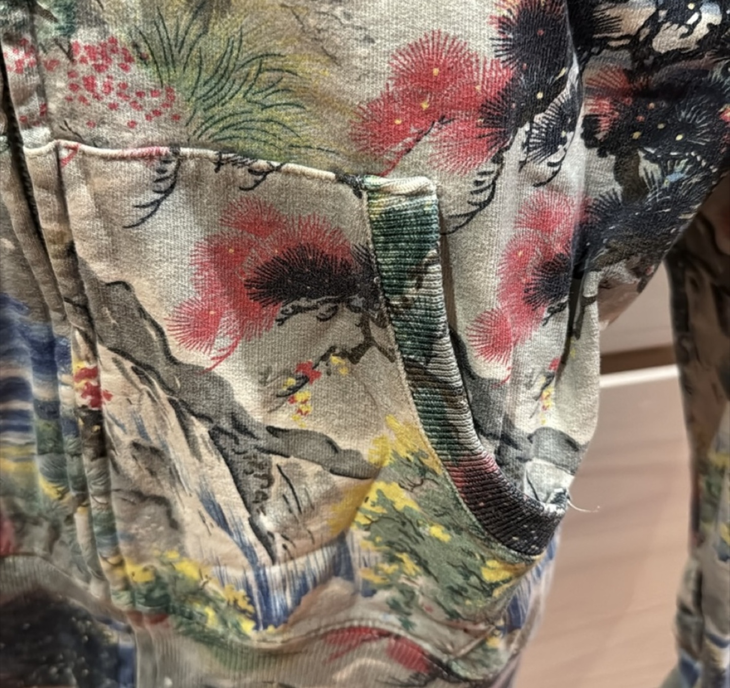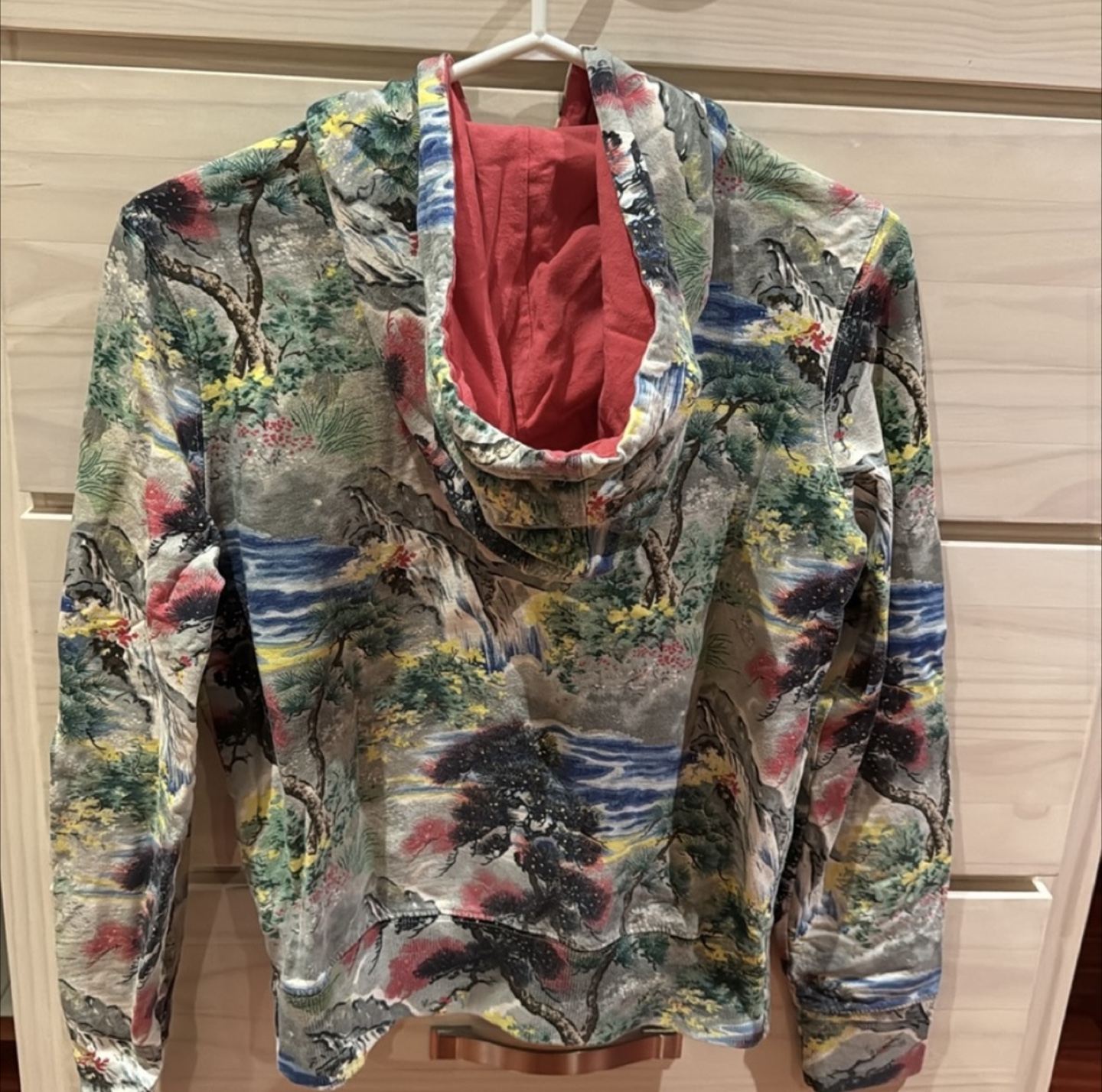 This is a Lucky Brand full zip hoodie in size XS. It features a unique landscape pattern and is made of 100% cotton. Perfect for layering or wearing on its own!