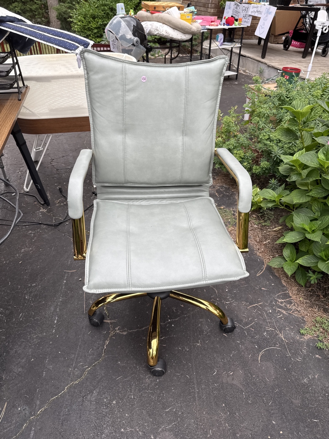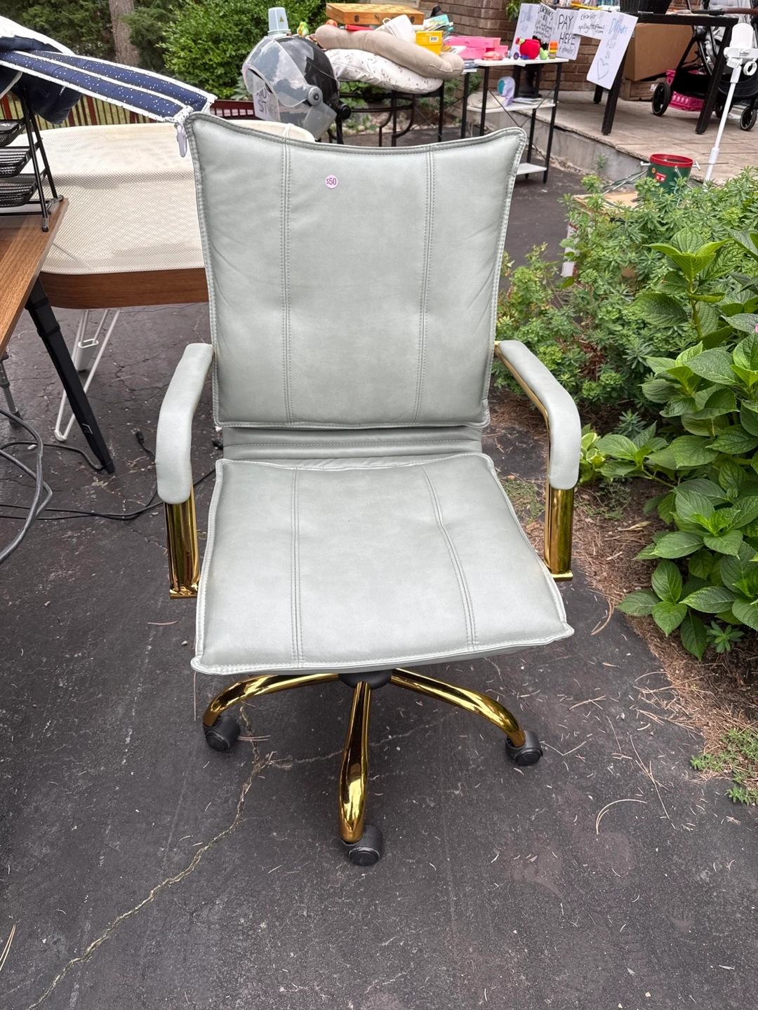 Office chair with a light green sage seat and back. It has gold-coloured accents on the frame and base. The chair is in good condition and ready for a new home!