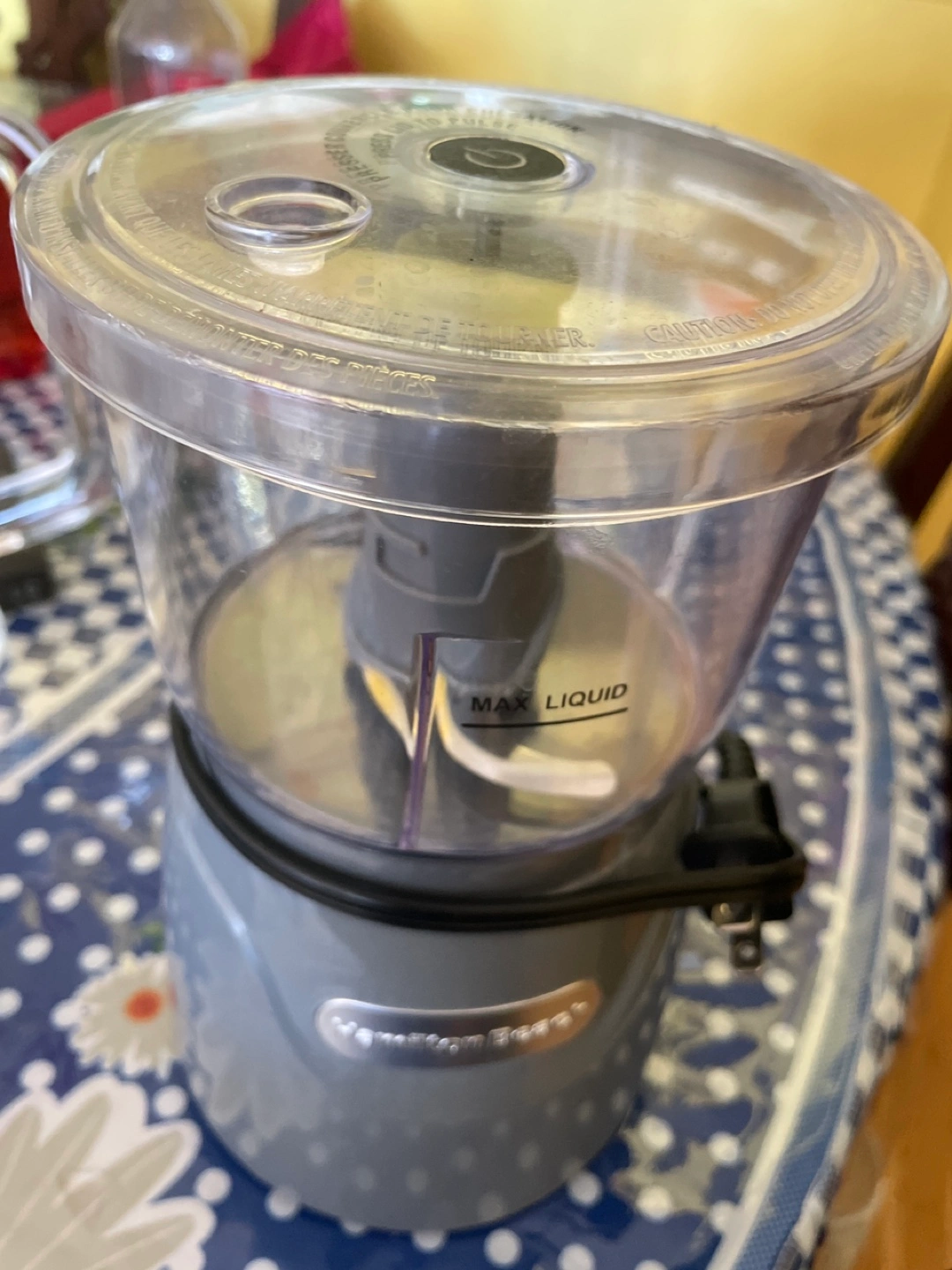 I'm selling a Hamilton Beach food chopper. It's in great condition and ready to help with your food prep needs! It features a clear lid with "PRESS LID TO PULSE" text and a "MAX LIQUID" indicator on the container