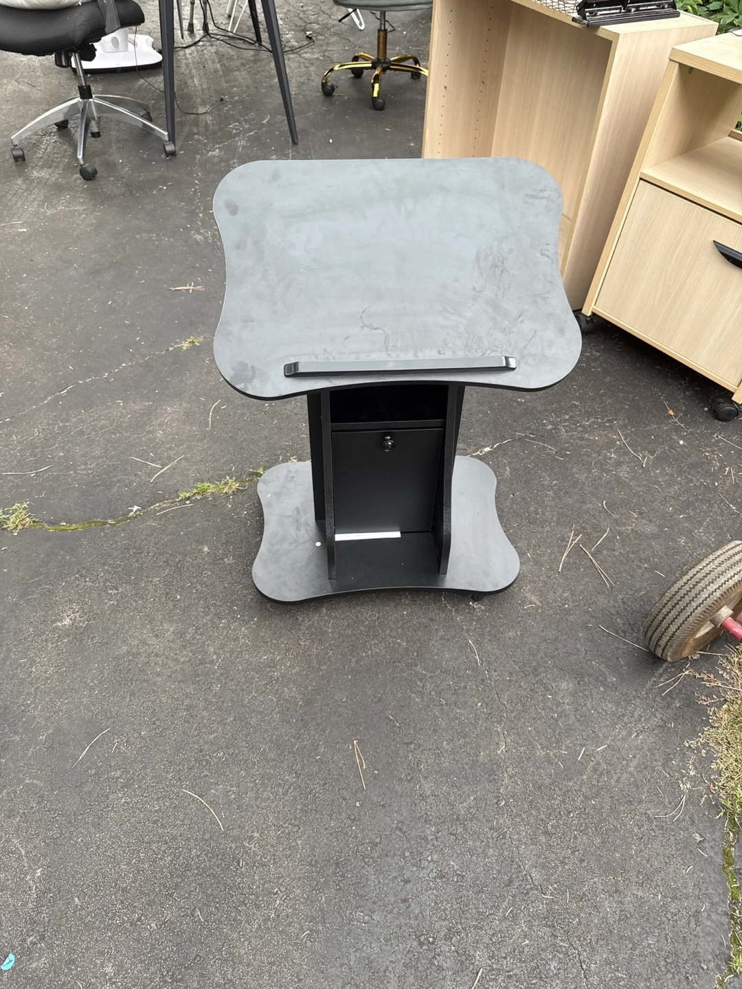 Selling a black presentation podium. It has a sturdy base and a convenient shelf for storage. It's perfect for speeches, presentations, or lectures.
