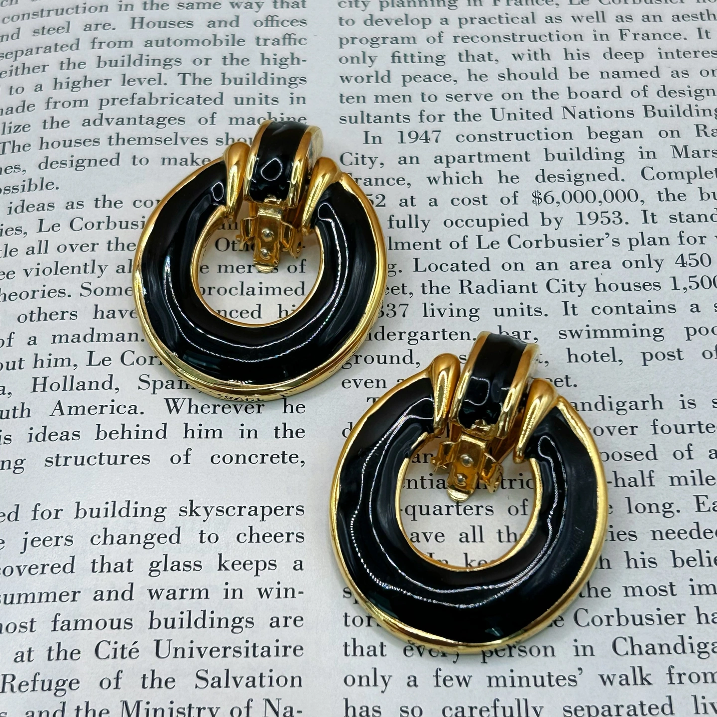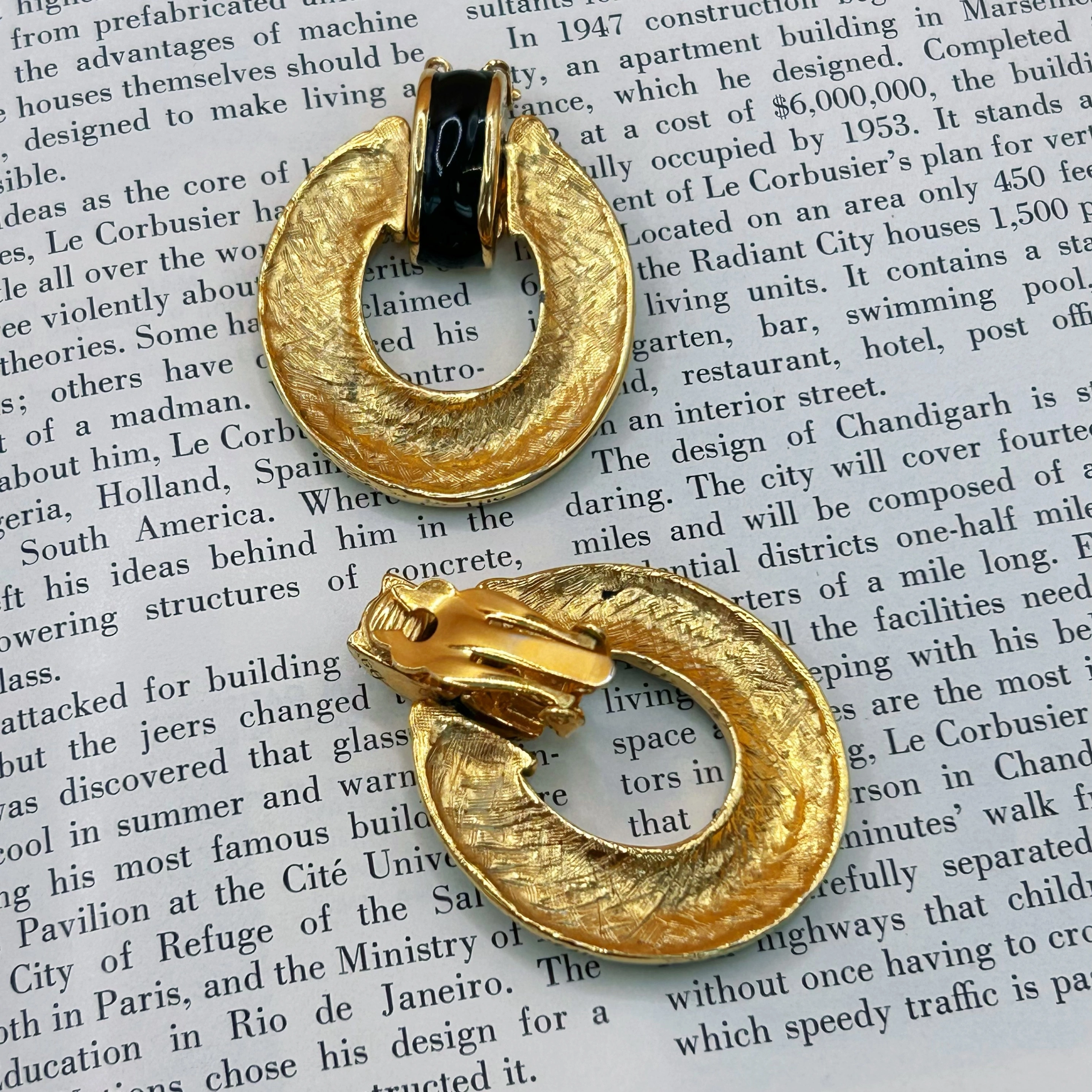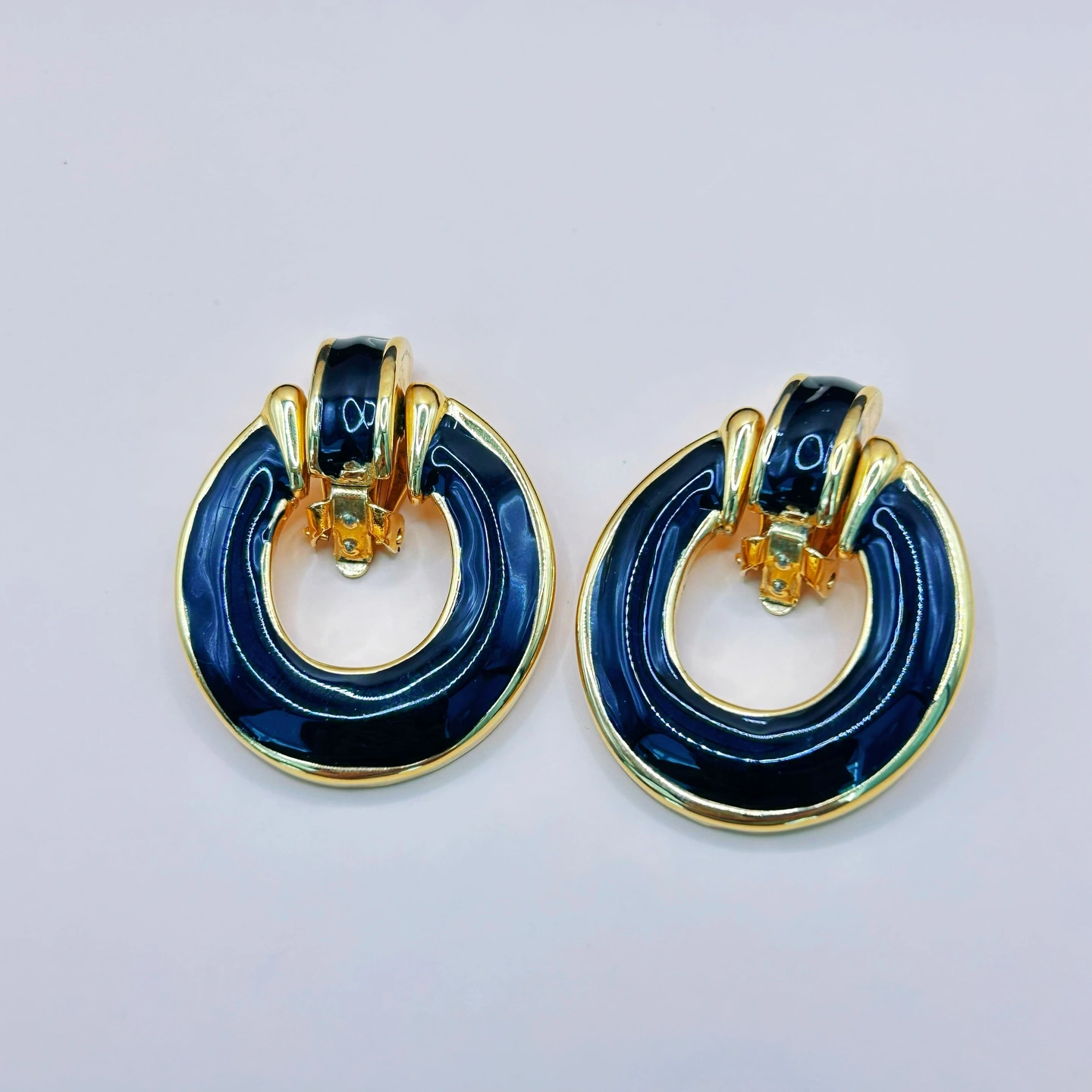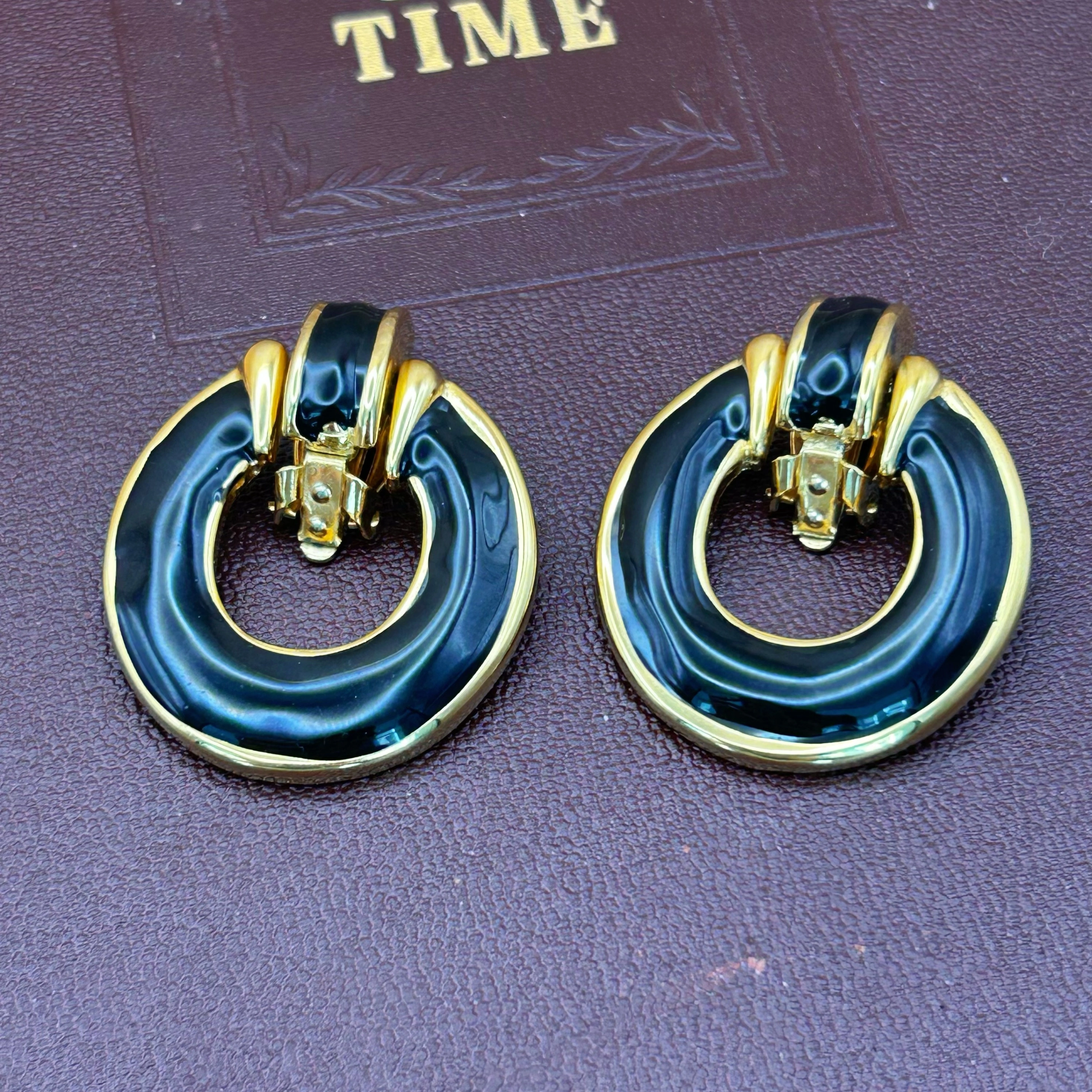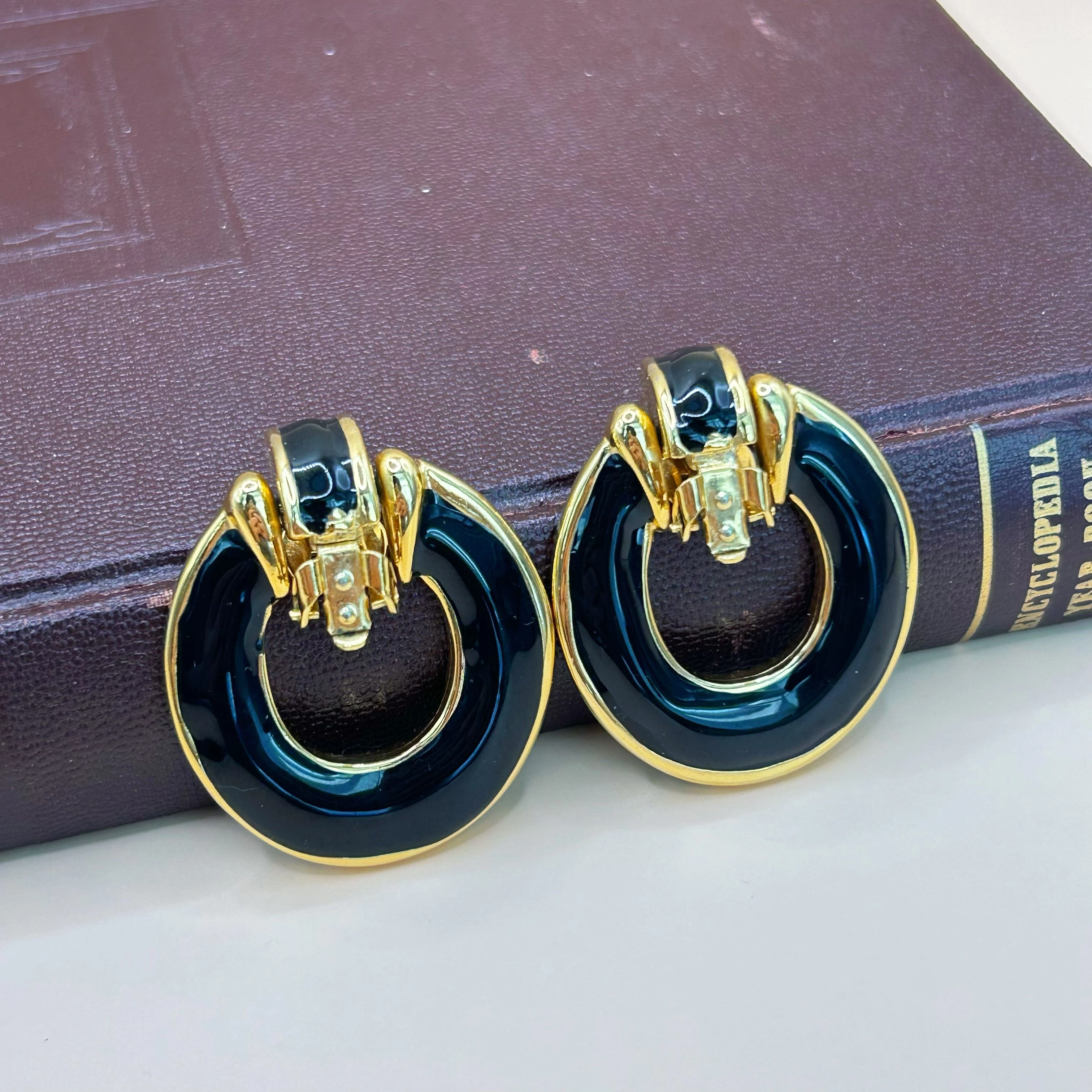 This pair of clip-on earrings features a bold round shape made of gold tone metal with shiny black enamel. The top part is movable, adding a bit of interest to the design. These earrings are unsigned but have a solid, high-quality feel. Estimated to be from the 1980s to early 1990s. Overall in very good vintage condition, with only minor signs of age. Please check the photos and video for details. Please review the photos and video carefully before buying. This is a real vintage item and shows natural signs of age and wear, which add to its charm. Please make sure you like it before ordering. If you have questions or want more pictures, please contact me — I’m happy to help. Return Policy Returns accepted. Buyer pays return shipping. Item must be returned in original condition. If the item arrives damaged, please contact me so we can find a solution.