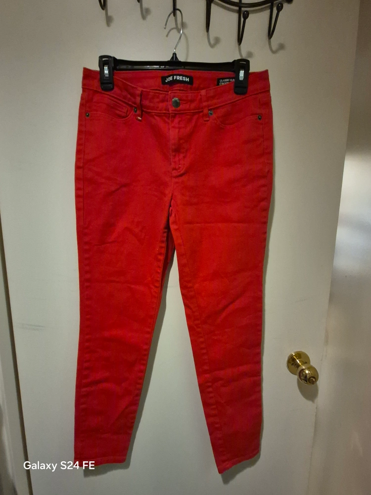Selling a pair of Joe Fresh classic slim jeans in a vibrant red colour! They are size 29 and made of 99% cotton and 1% spandex, making them super comfy. These jeans are in great condition and ready for a new home!
