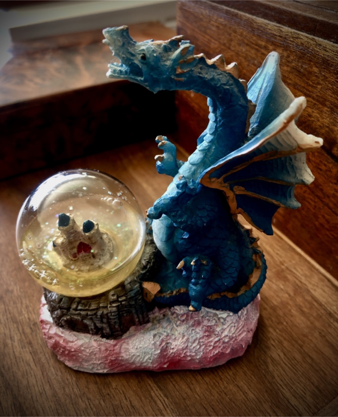 A charming well detailed dragon & snow globe, perfect for adding a touch of fantasy to any room! The dragon is a beautiful shade of blue, perched atop a base that looks like a castle ruin with a pink cloud. Inside the globe, there's a castle and glittery gold snow, creating a magical scene when you shake it. About the size of a hand. Check other listing for another cool dragon!