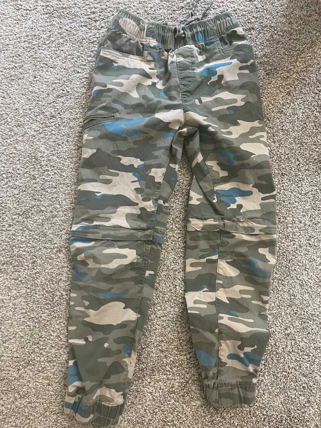 Selling a pair of camo jogger pants. They're in great shape and ready for a new home. The camo design is a mix of greens, beige, and a touch of blue. Converts into shorts for all season use. Perfect for casual wear or outdoor adventures!
