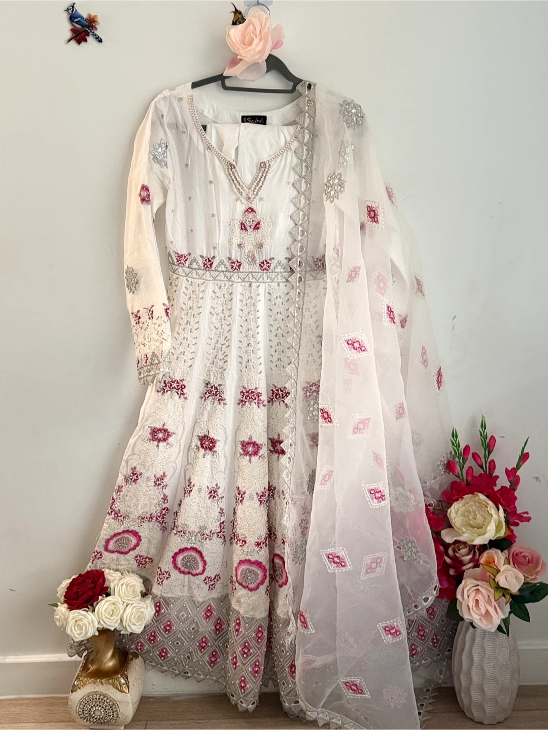 Beautiful Sajni Anarkali dress in white with delicate embroidery! Perfect for special occasions or adding a touch of elegance to your wardrobe. The dress features intricate detailing and a flowing silhouette.