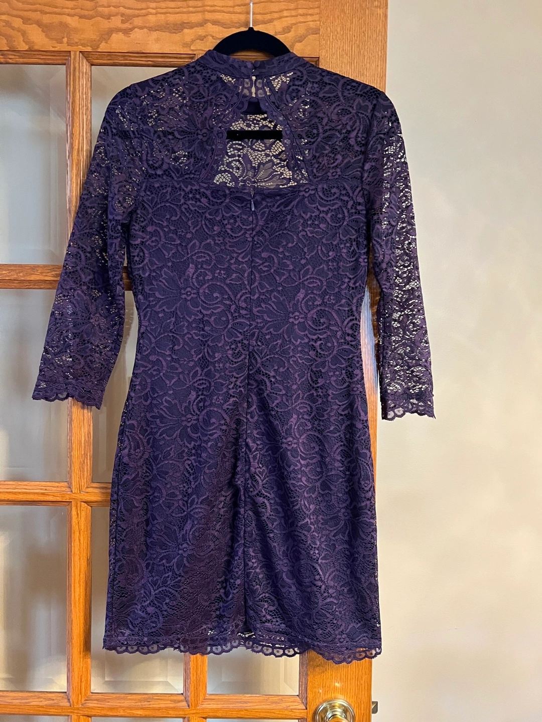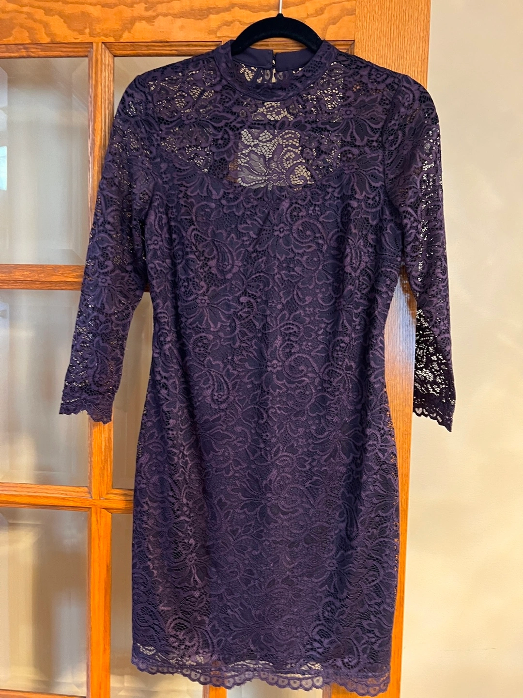 Beautiful purple lace dress from Le Chateau. It's in great condition and perfect for a night out or special occasion! The lace detailing is really lovely, and the colour is a rich, deep purple that's sure to turn heads