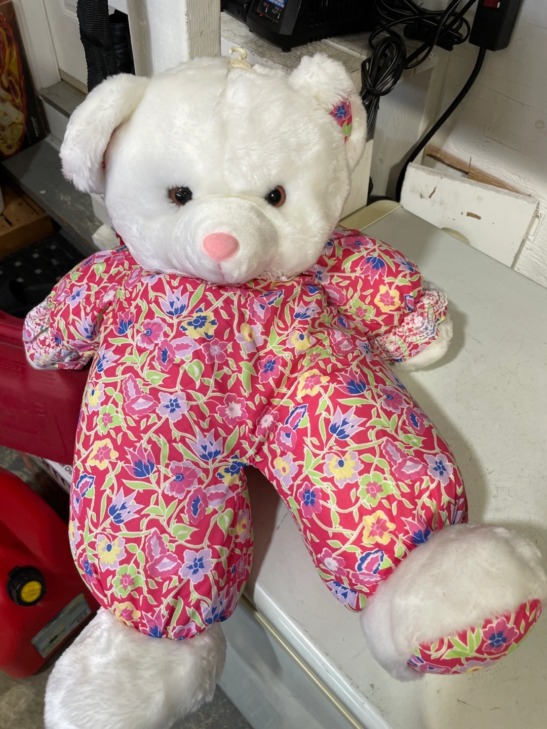This cuddly teddy bear is looking for a new home! It's a soft, white plush bear wearing a cute floral patterned outfit. Perfect for snuggling or as a decorative piece. Its new without tag.