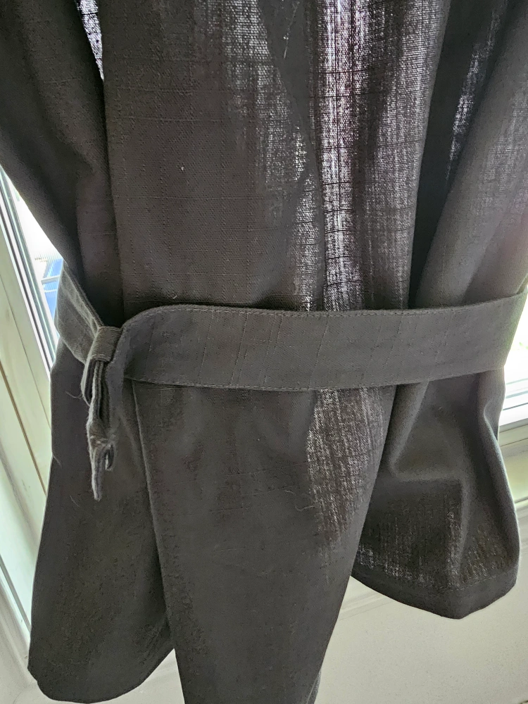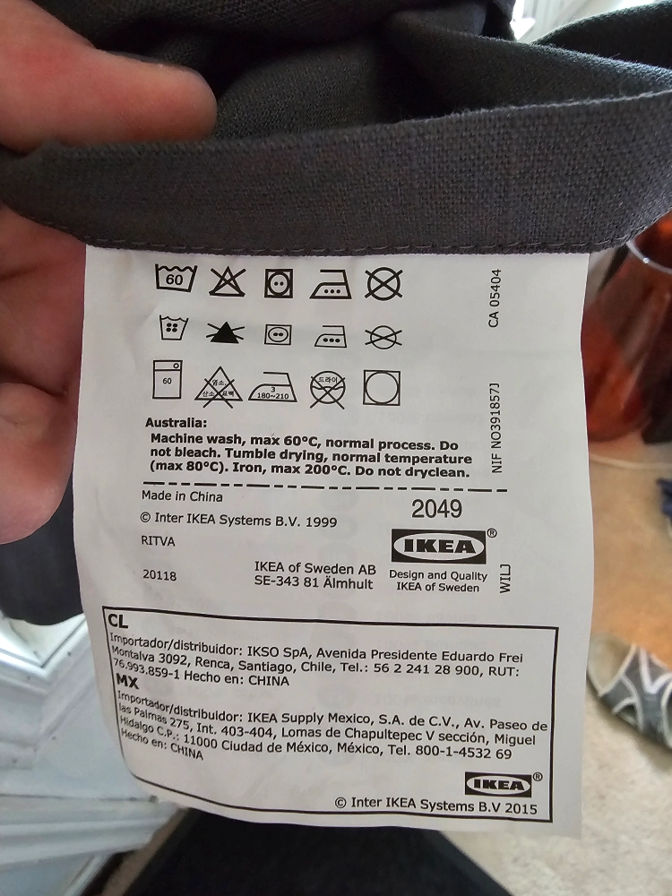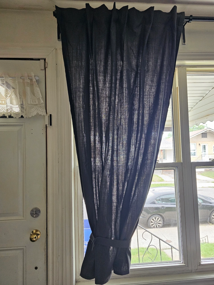 Selling a gently used IKEA Ritva curtain panel in black. This curtain is perfect for adding a touch of elegance to any room. It's made of a nice material and is in great condition. The label indicates it's machine washable, which is super convenient! Pack of 2. 60.5' length 55.5 across