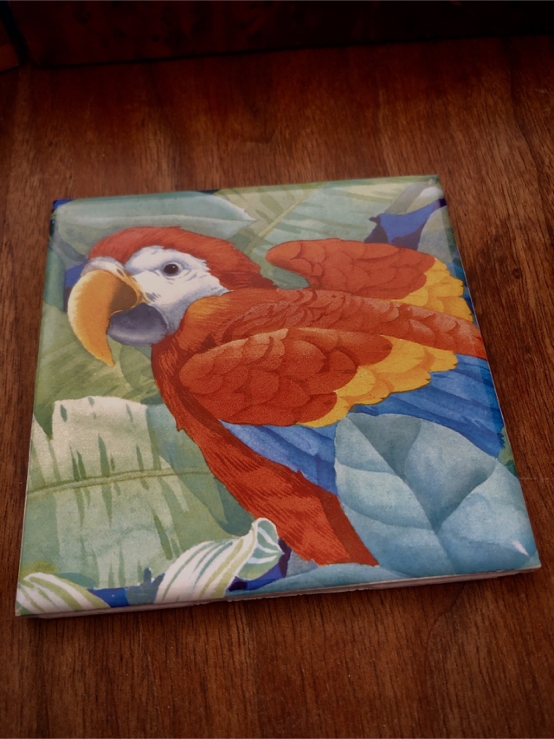 Cute tile coaster with a vibrant parrot print! Perfect for adding a touch of tropical flair to your coffee table or desk