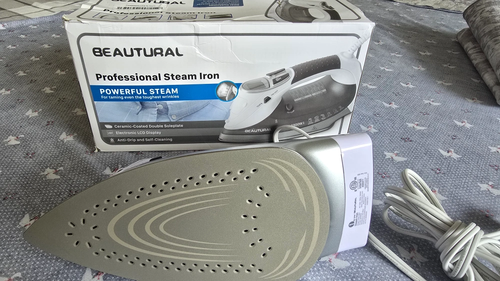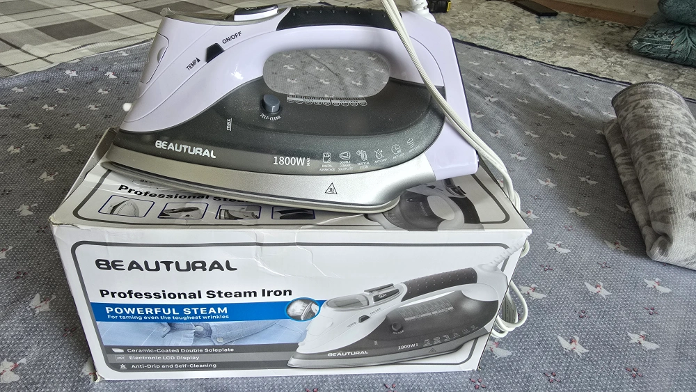 I'm selling a BEAUTURAL professional steam iron. It's in great condition and ready to tackle even the toughest wrinkles! It features a ceramic-coated double soleplate, an electronic LCD display, and anti-drip and self-cleaning functions