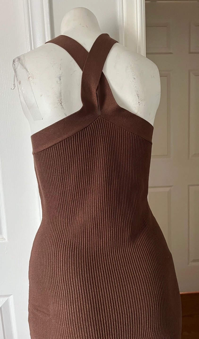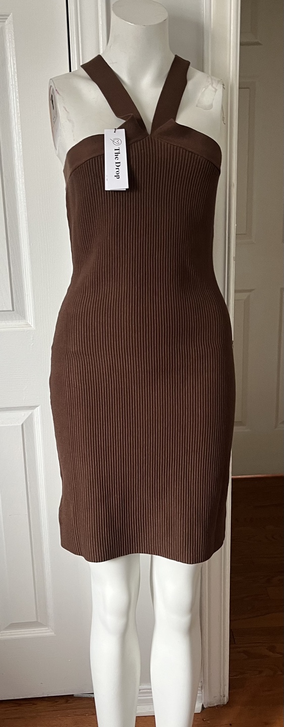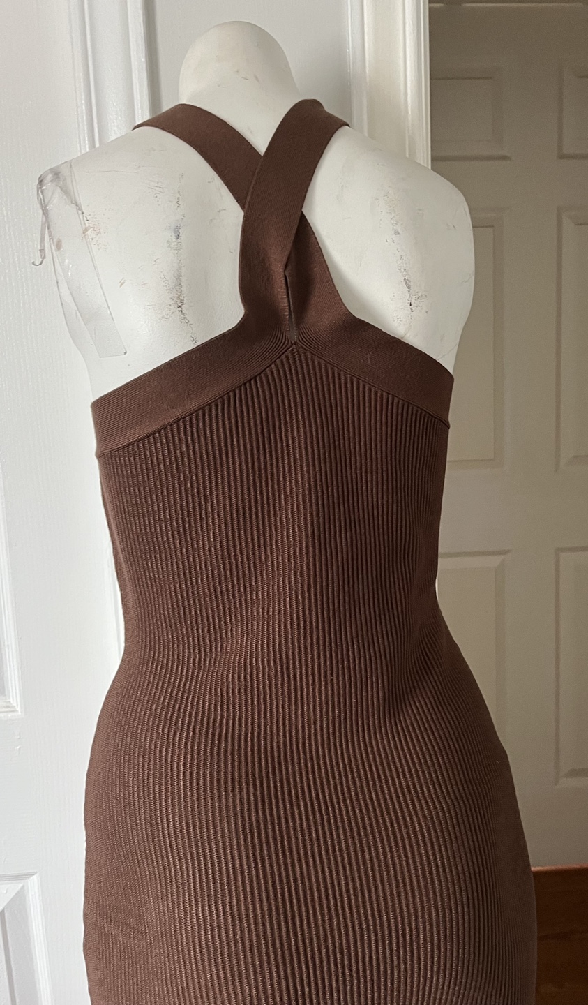 Cute brown ribbed dress from The Drop in size medium! It features a unique cross-back design. Perfect for a night out or a casual day with some cute sneakers