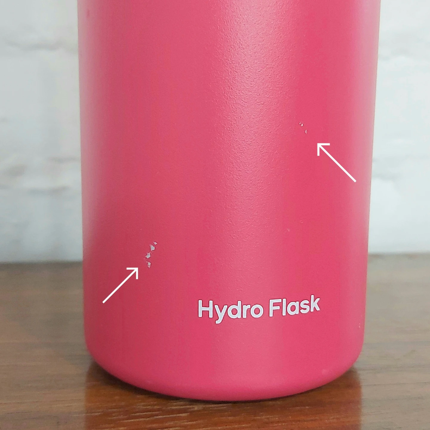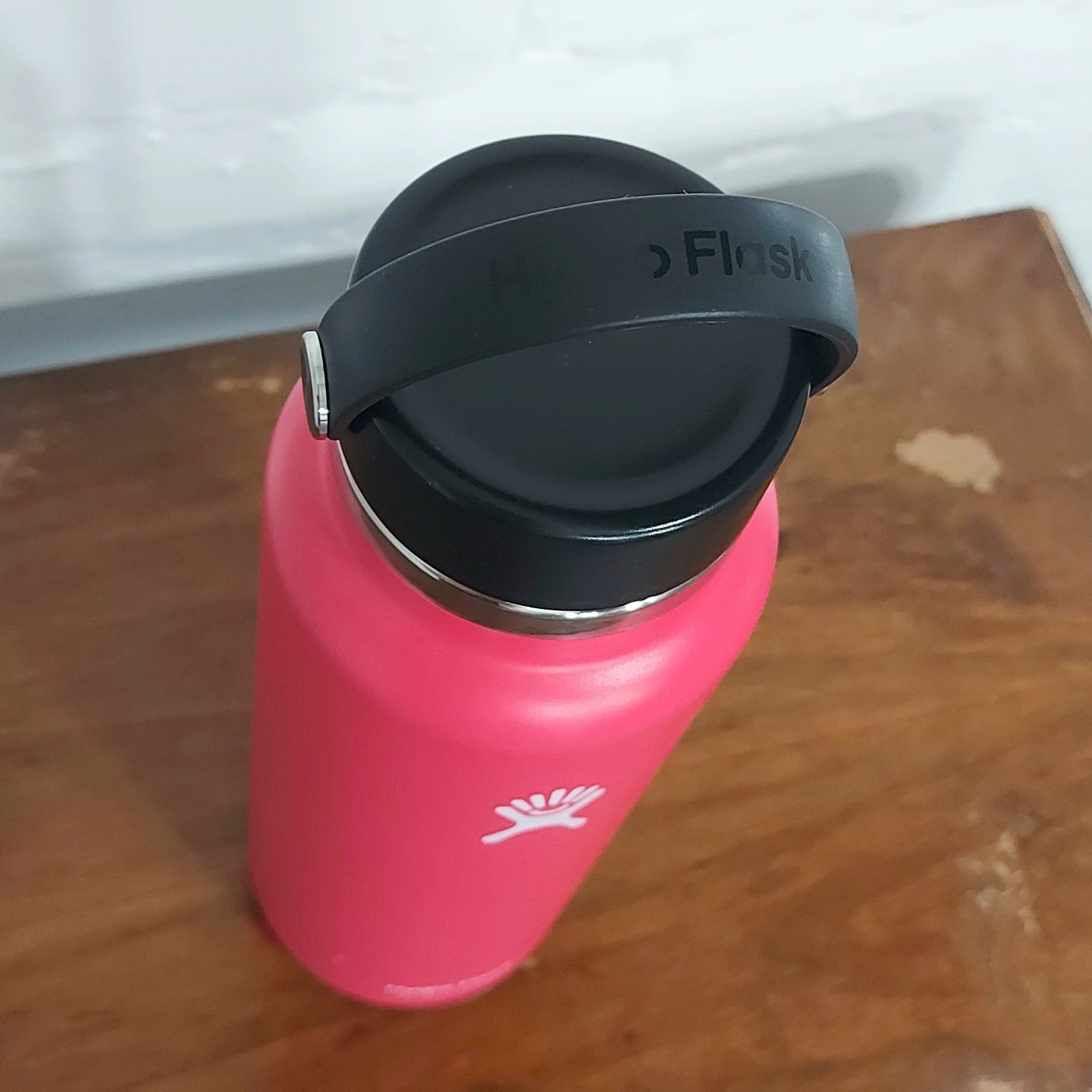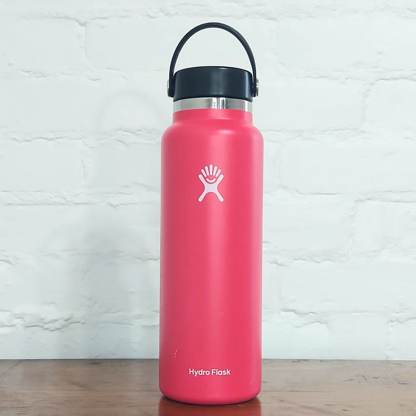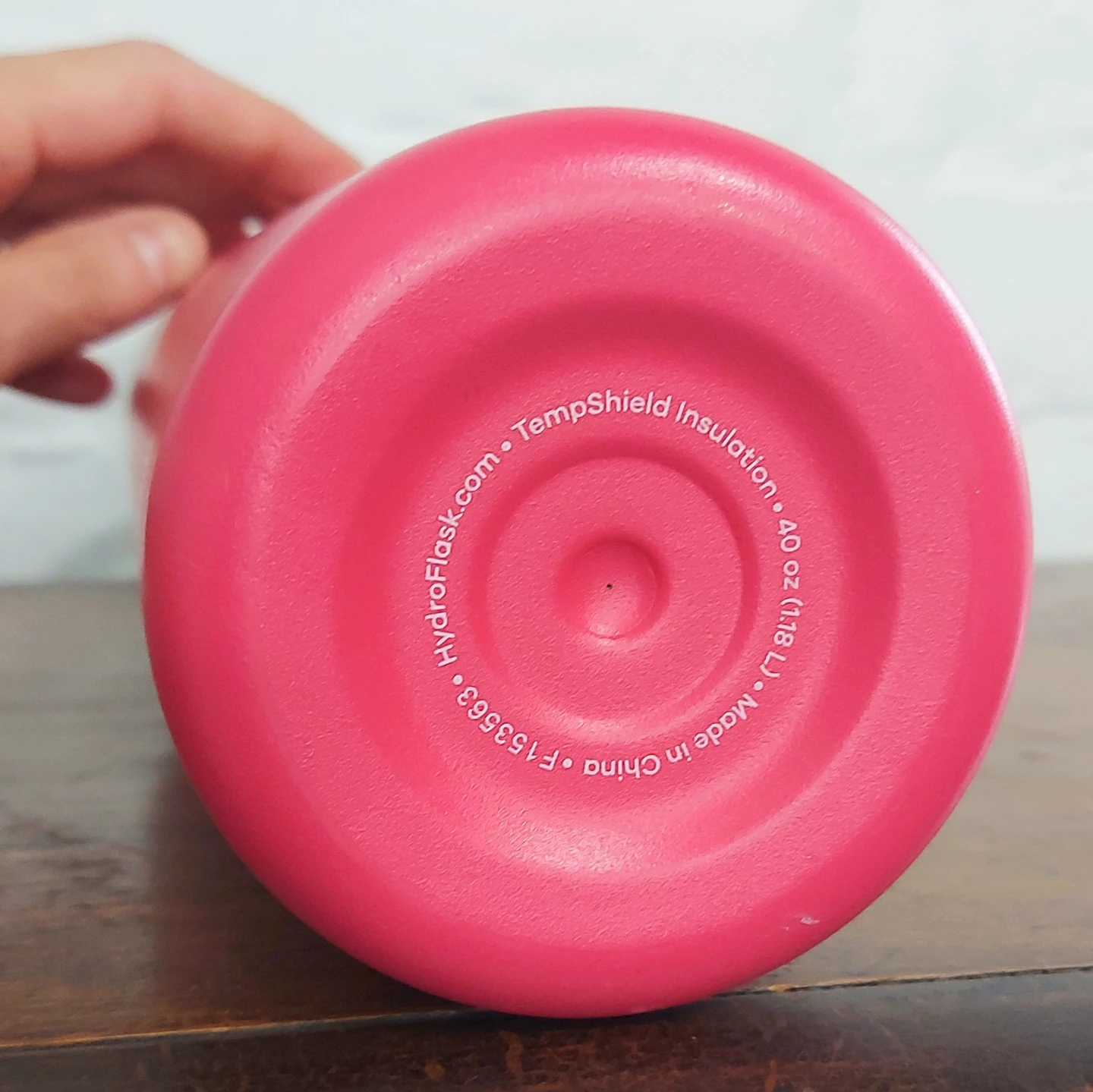 Hydro Flask 40oz pink insulated water bottle— has been used previously, bery clean, always hand washed. There are a couple of minor cosmetic scratches towards the base from vehicle cup holder use, visible in photos. Insulation works, drinks stay very cold, lid stays on, no leaks.