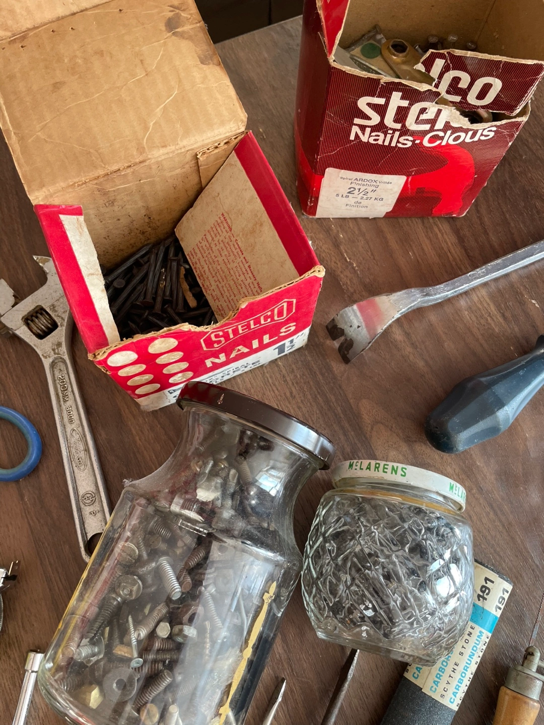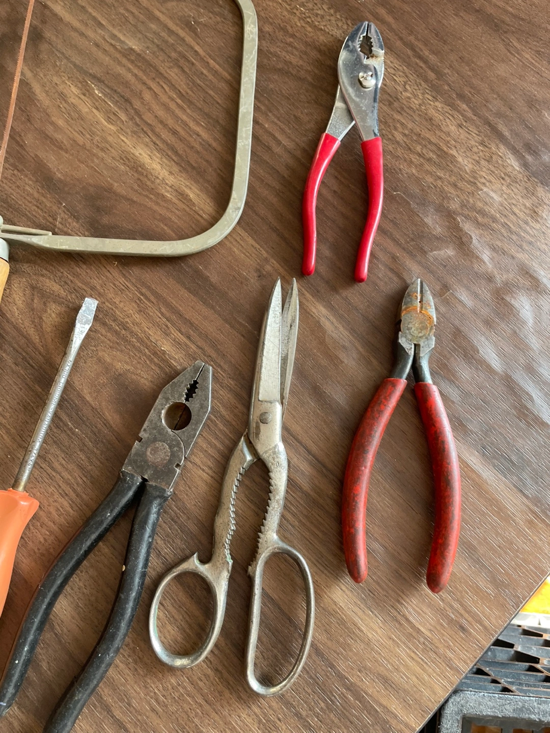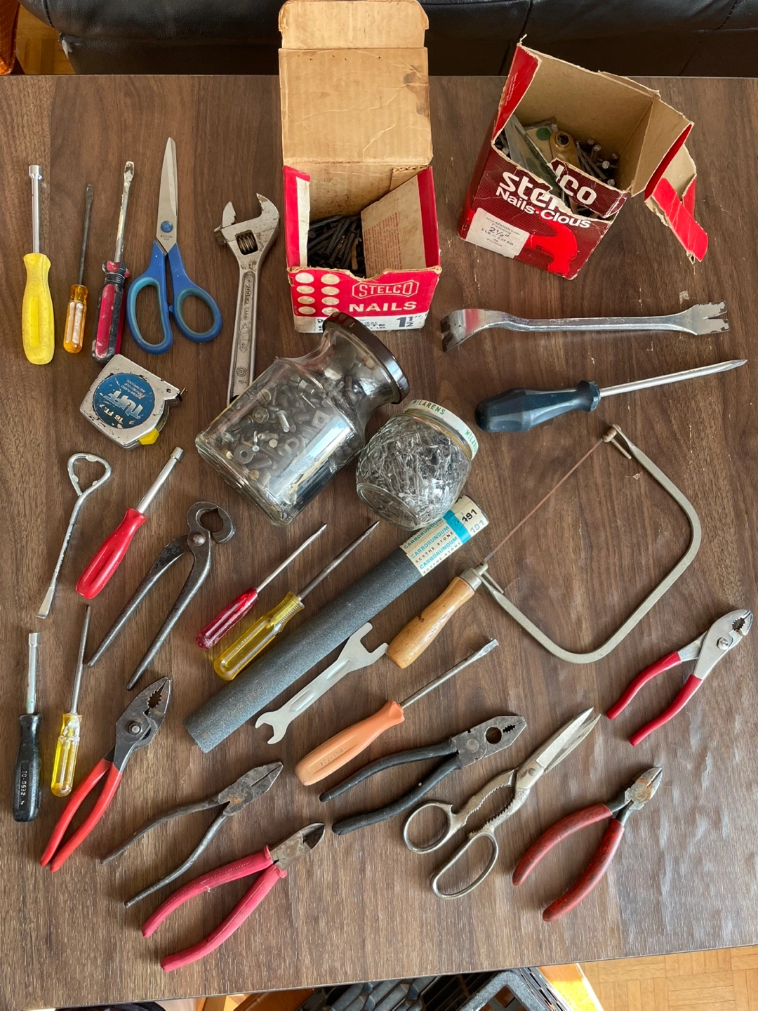 Includes a tape measure, Wiss scissors, a variety of wrenches, pliers, screwdrivers, nails and more. See photos for everything included